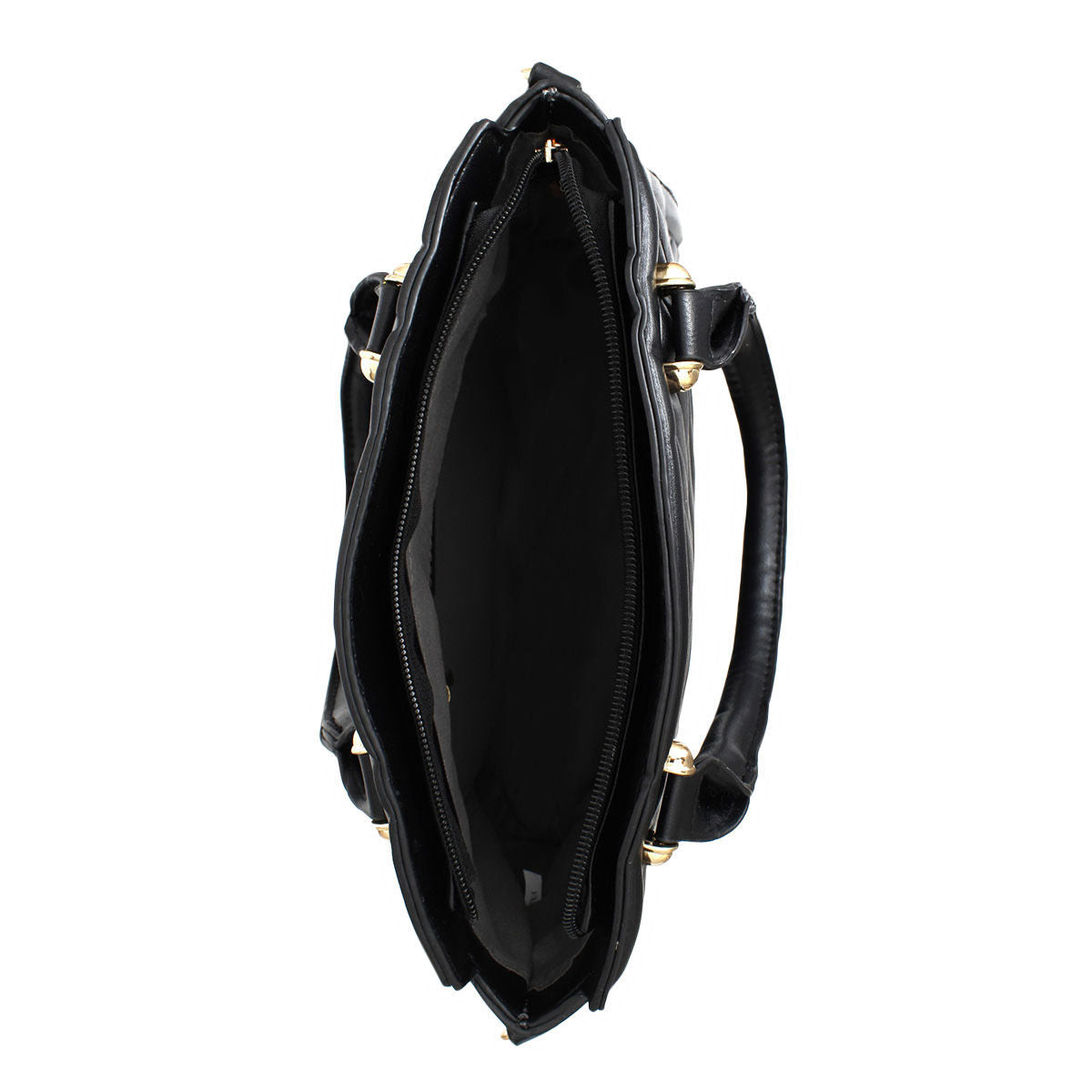 Women's Purse and Wallet Set. Black Vegan Faux Leather Quilted Handbag Featuring Chevron Pattern. Main Zipper Closure. Zipper Pocket on Back. Detachable Adjustable Shoulder Strap Included. Includes Matching Double Zipper Wallet with Card Slots and Zipper Pocket. Top Handles measure 5.5 inches tall.