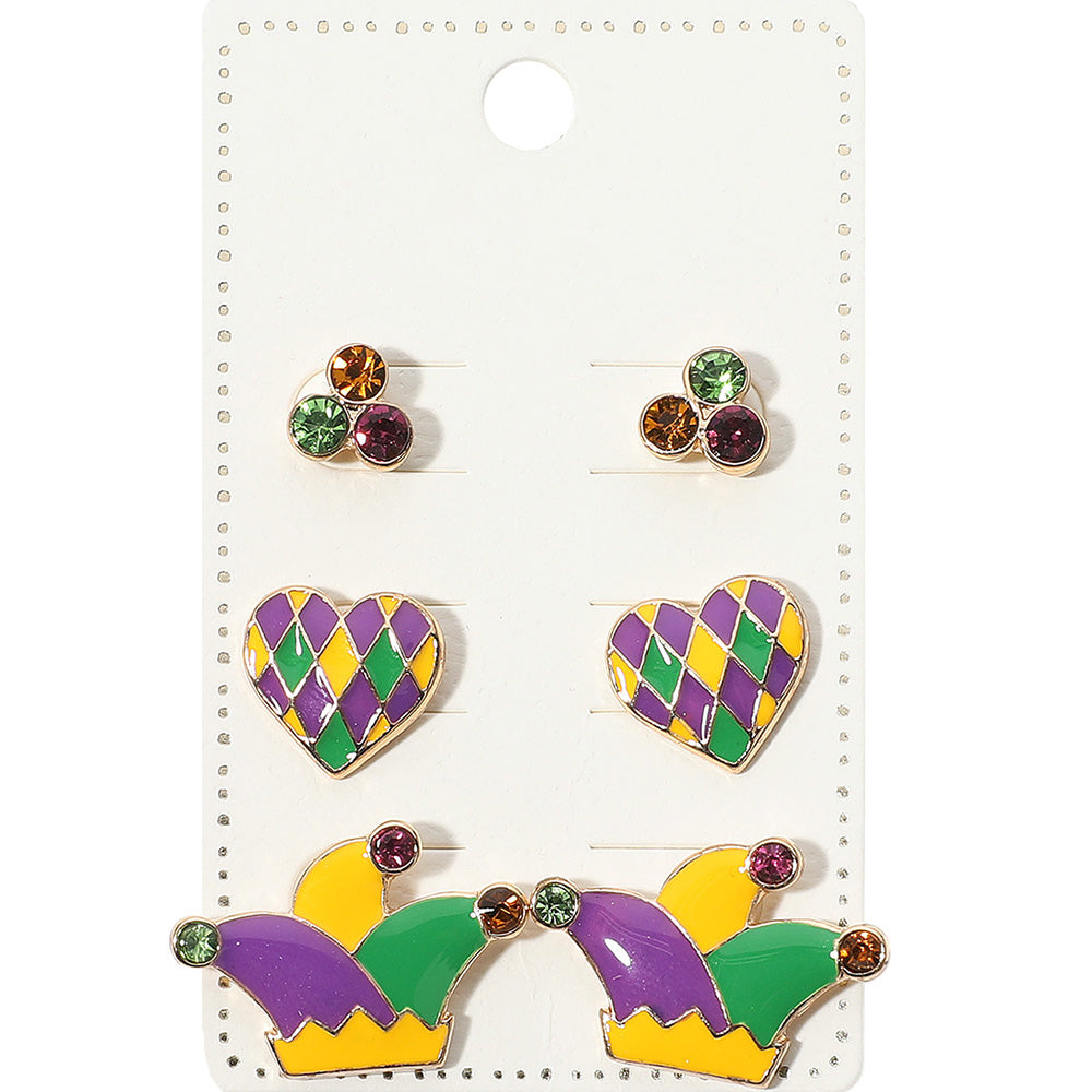 iLLASPARKZ 3Pairs - Enamel Mardi Gras Heart Hat Stud Earring Set
