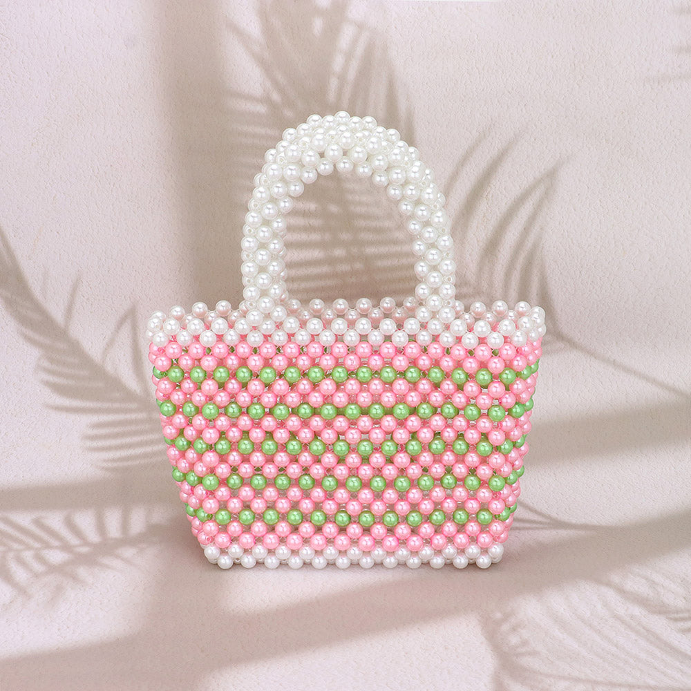 This mini handbag features a refined beaded exterior with a structured silhouette and curved top handles. Ideal for evening events or statement accessorizing, it brings a bold yet elegant flair to any outfit.