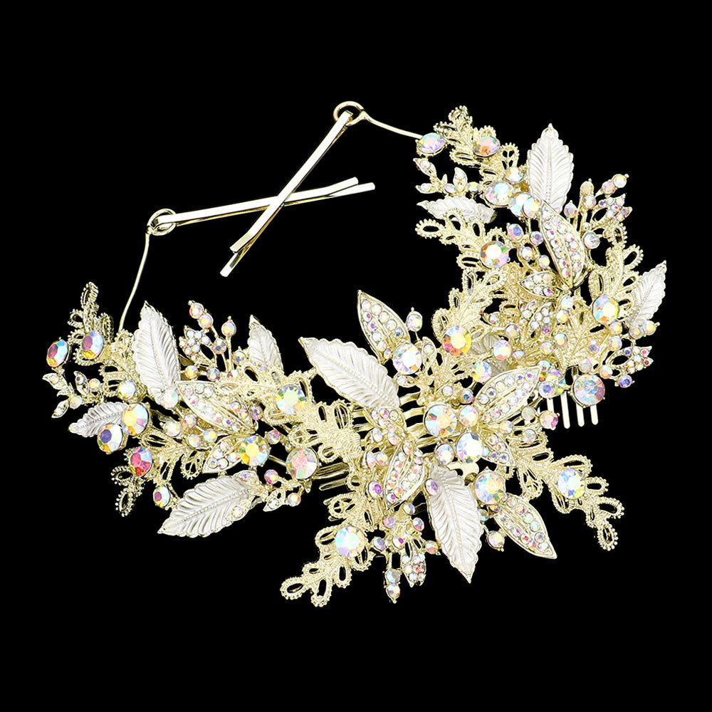 Graceful floral hairpiece featuring delicate leaf and bead detailing arranged in a natural, cascading design. Perfect for bridal or formal styles, this accessory enhances updos with a romantic, nature-inspired elegance that complements a variety of special occasion looks.