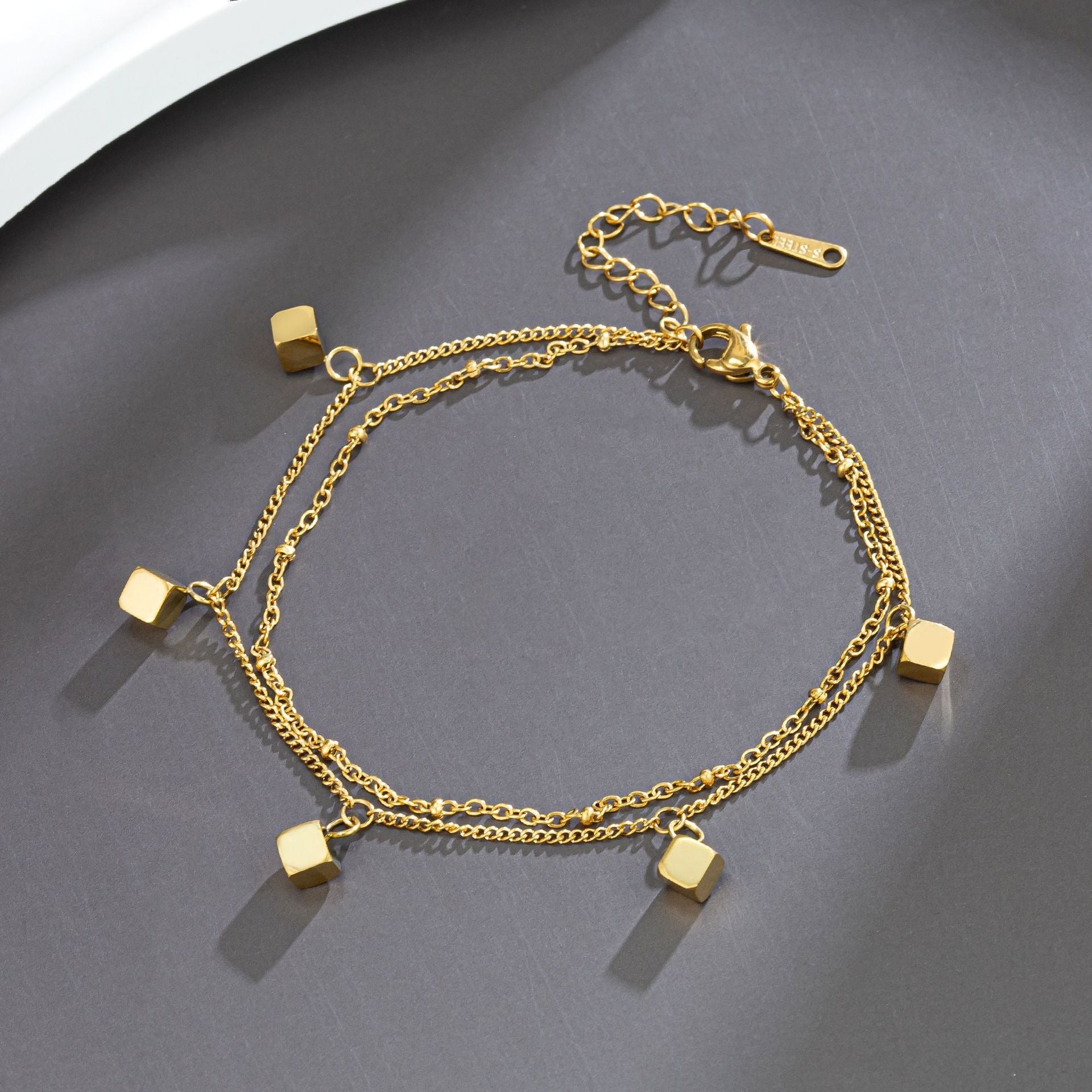 This 18K gold-plated, light-luxury, double-layered square anklet perfectly blends simplicity and sophistication, making it an ideal accessory for stylish women to enhance their overall look. Whether paired with sandals, a dress, or a beachfront getaway, it perfectly complements the wearer's unique style and effortless charm.