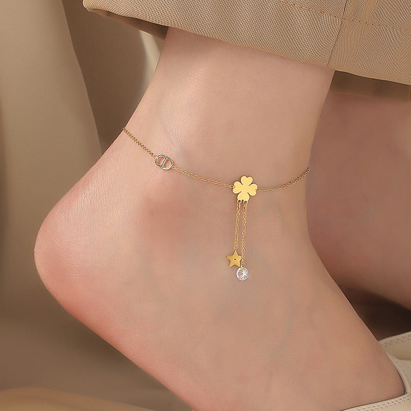 This 18K gold tasseled star and four-leaf clover anklet blends romance and elegance, perfect for women seeking a touch of effortless luxury and sophistication. It is not only the finishing touch for summer beaches and daily outings, but also a lucky choice for gifts.