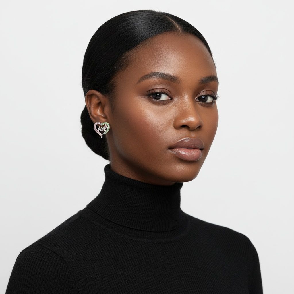 Alpha Kappa Alpha Sorority Paraphernalia Women's Stud Earrings. Greek Merch Silver Metal with Pink and Green Rhinestone Detailing Heart Shaped Stud Earrings Featuring AKA Greek Letters. Post Backing.