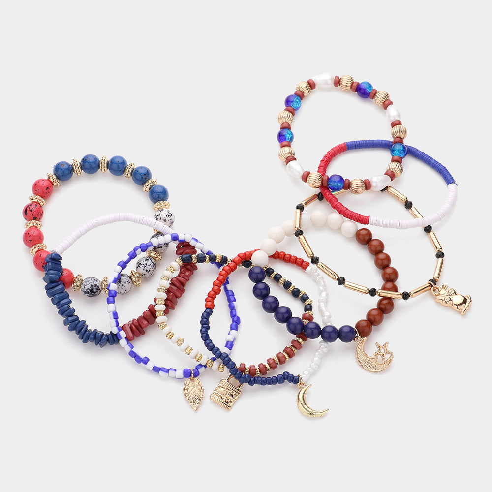 iLLASPARKZ 9PCS - Metal Owl Crescent Leaf Lock Charm Pointed Various Beads Beaded Stretch Multi Layered Bracelet
