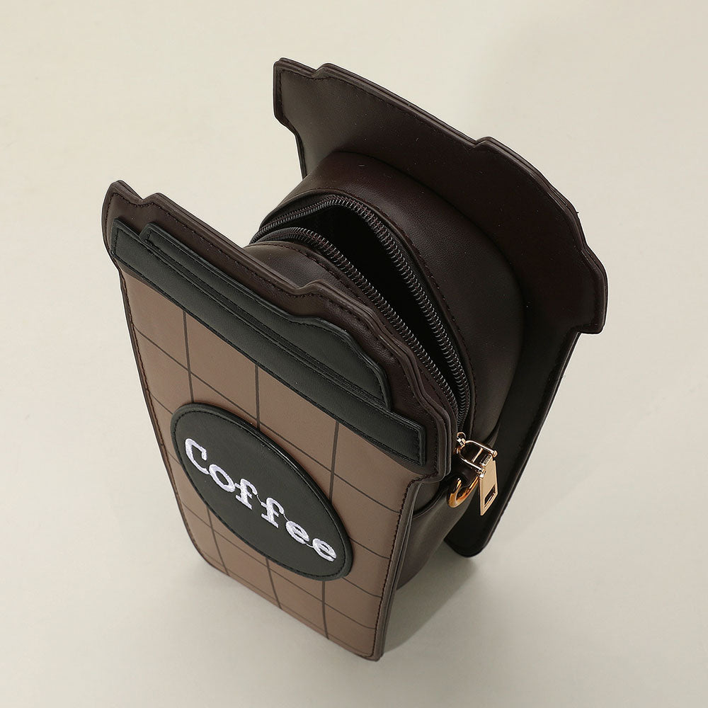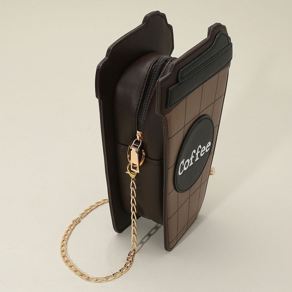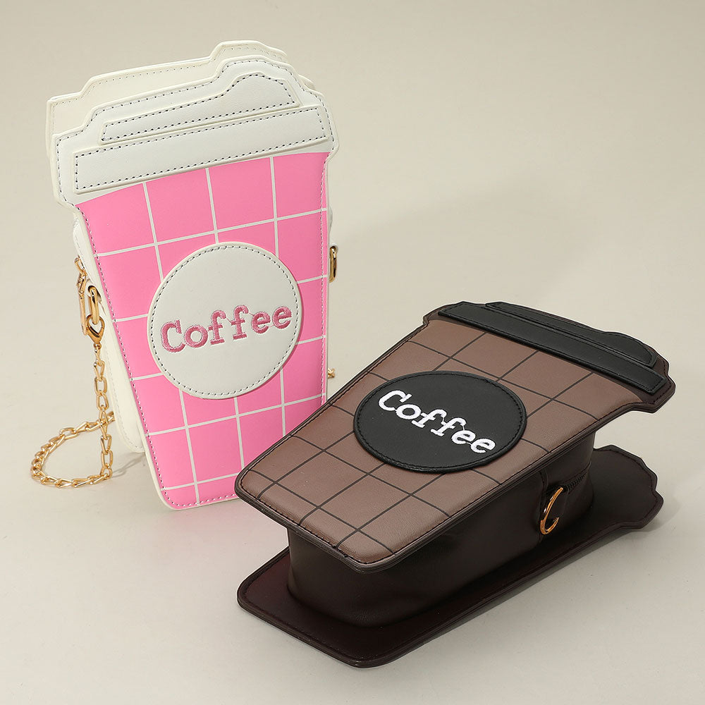 Fun and stylish coffee cup shaped crossbody bag featuring a grid design, bold "Coffee" print, and a sleek chain strap. A quirky and eye-catching accessory ideal for café lovers and trendsetters.
