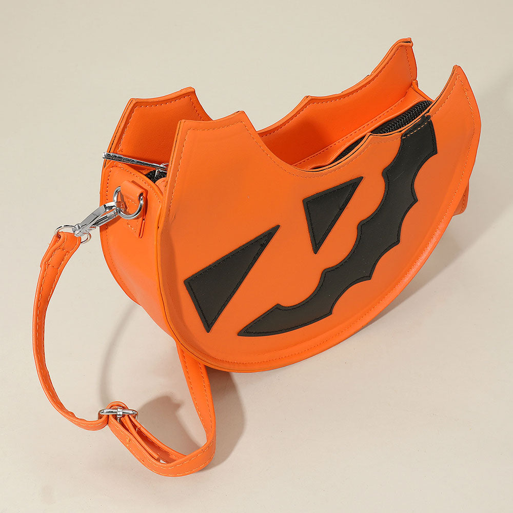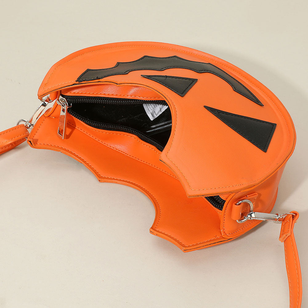 Add spooky charm to your outfit with this jack-o’-lantern crossbody bag, shaped like a pumpkin slice with bold face detailing and an adjustable strap—perfect for Halloween festivities!