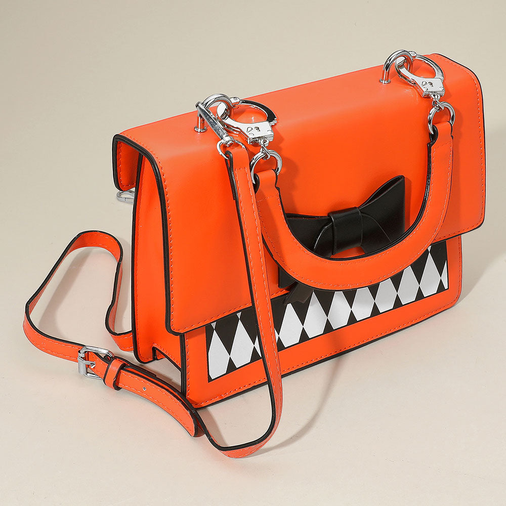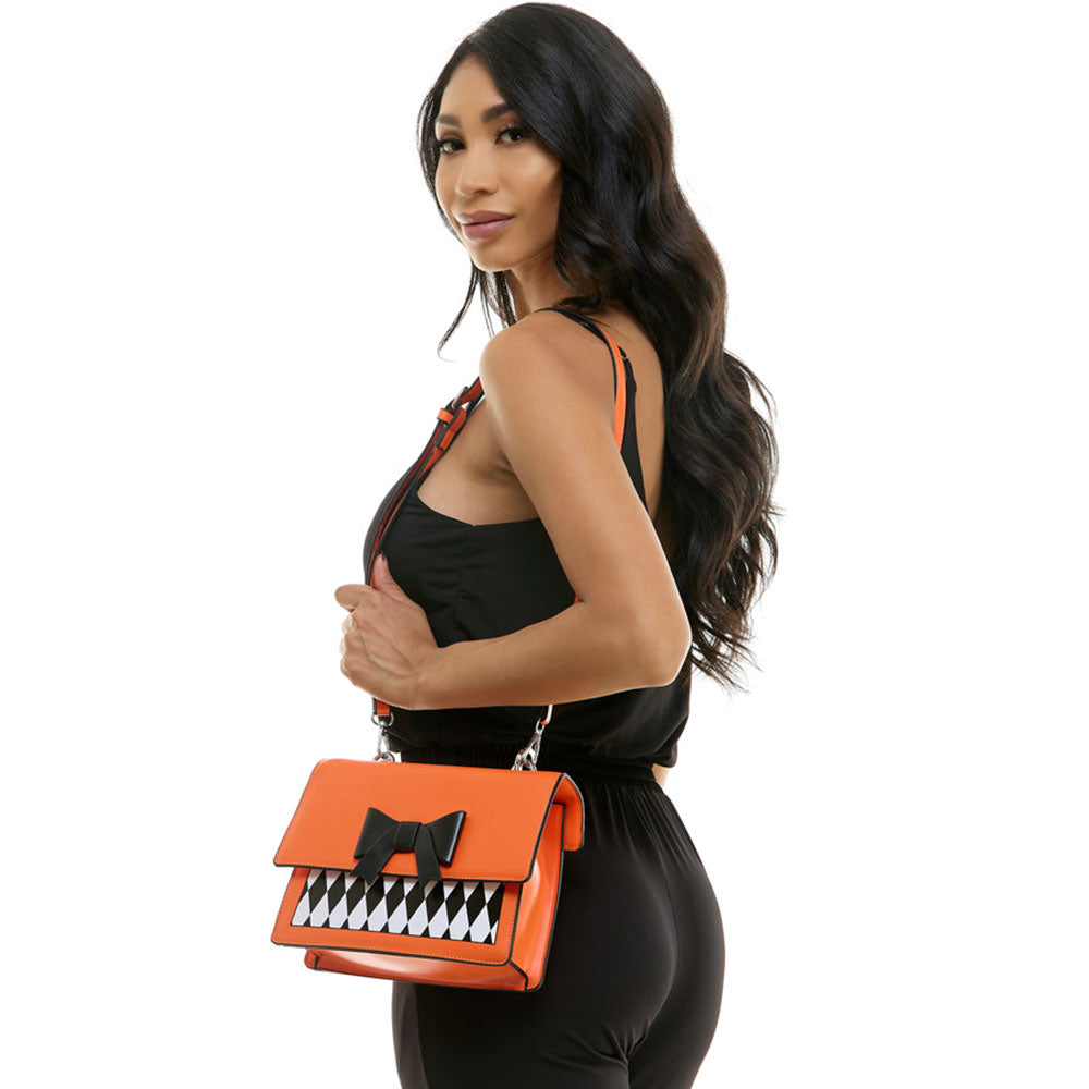 iLLASPARKZ Faux Leather Harlequin Pattern Bow Accent Halloween Handbag / Crossbody Bag