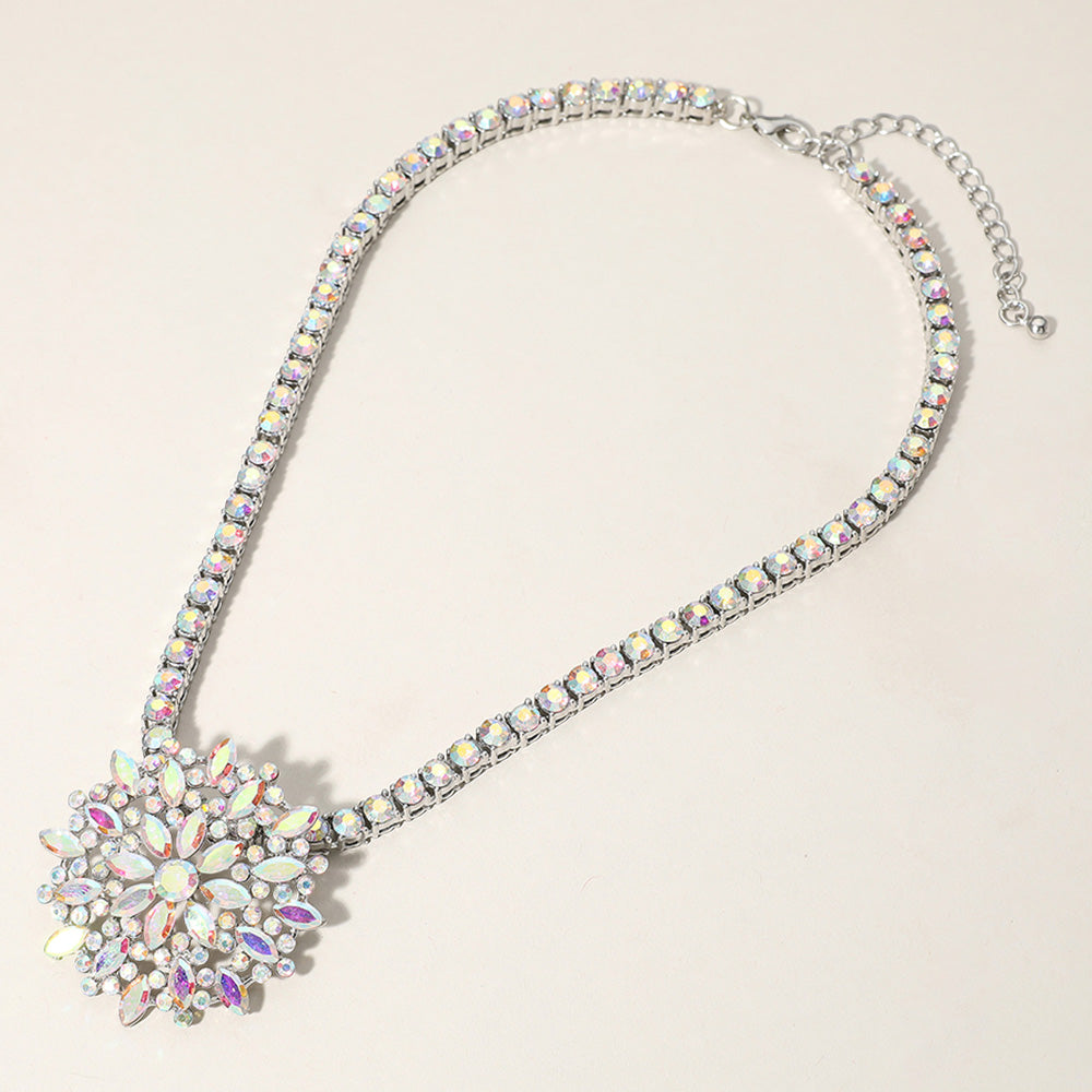 Elegant jewelry set featuring a dazzling snowflake pendant and matching stud earrings. Adorned with radiant rhinestones, ideal for weddings, formal events, or adding sparkle to special occasions.