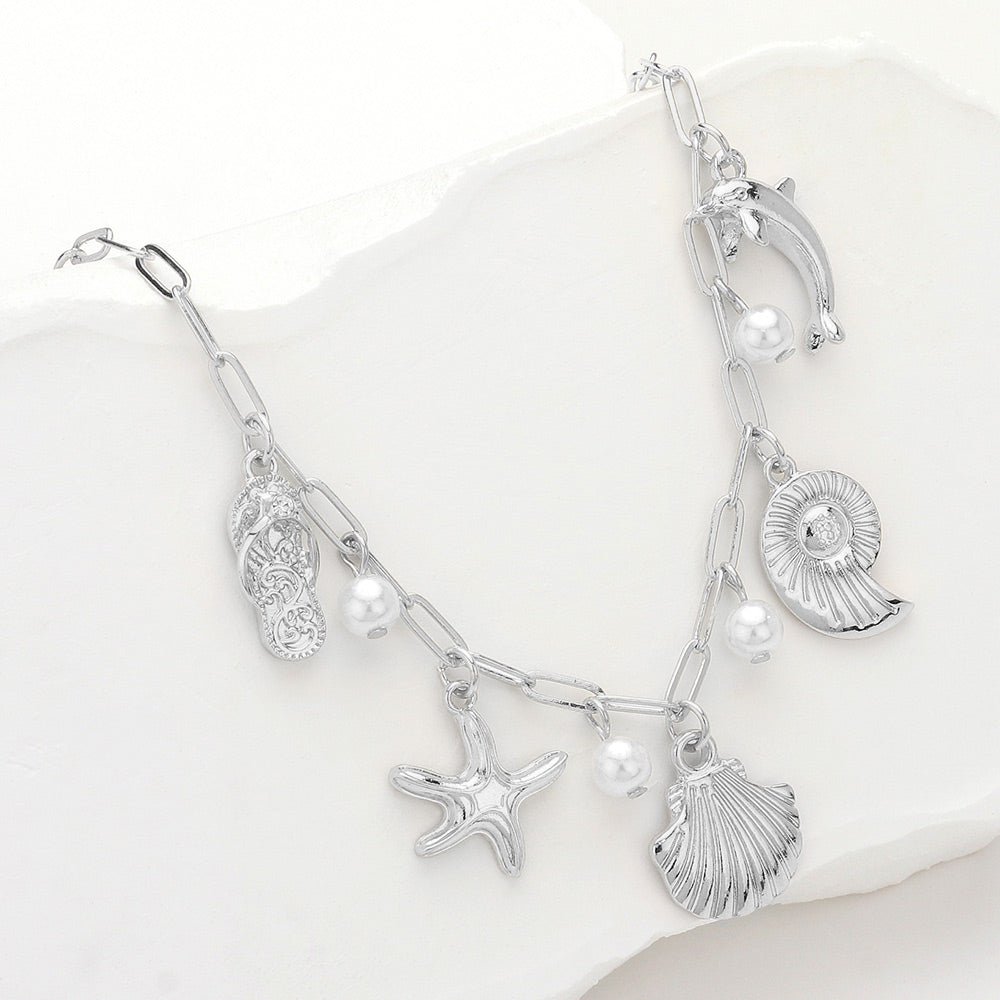 iLLASPARKZ Metal Shell Starfish Flip Flop Dolphin Pearl Charm Station Textured Paperclip Chain Necklace