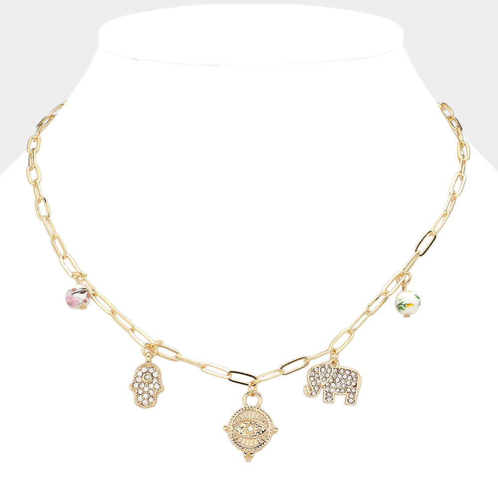 iLLASPARKZ Stone Paved Evil Eye Hamsa Hand Elephant Porcelin Ball Charm Station Paperclip Chain Necklace