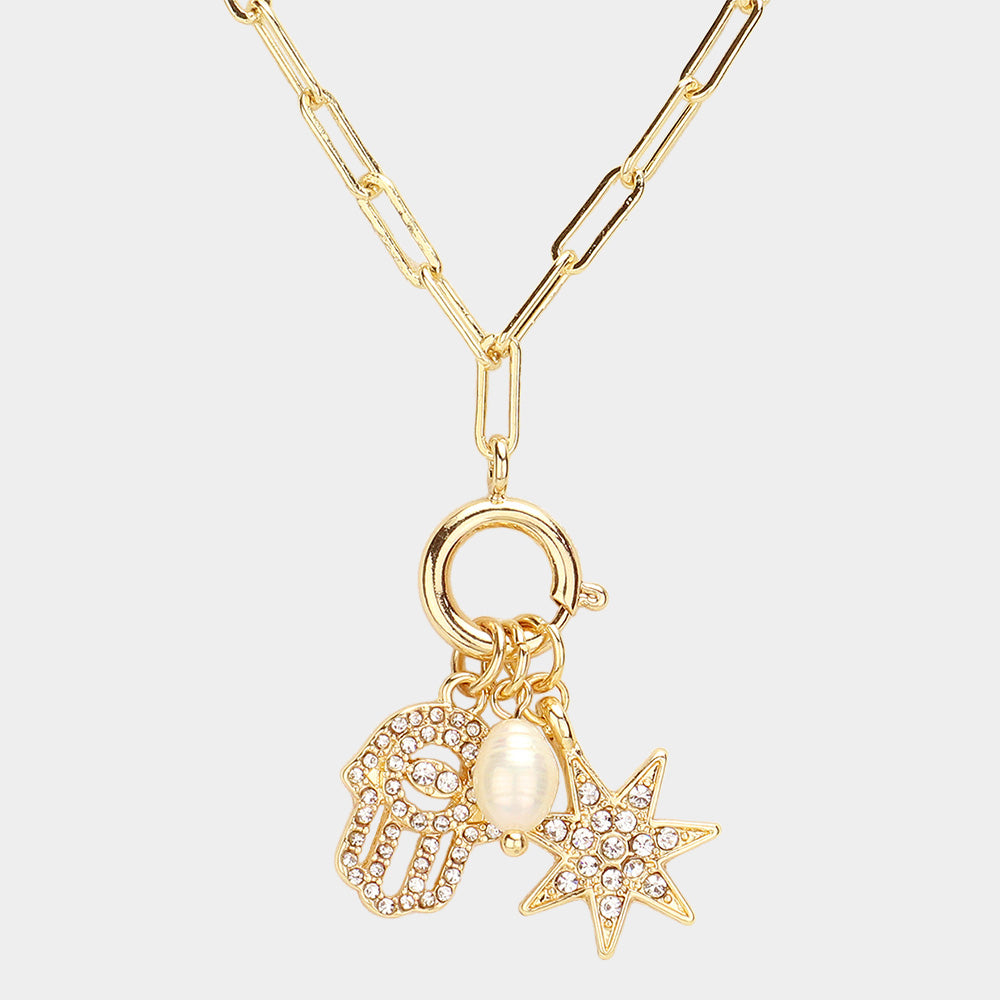 iLLASPARKZ Stone Paved Hamsa Hand Sunburst Pearl Charm Pointed Paperclip Chain Necklace
