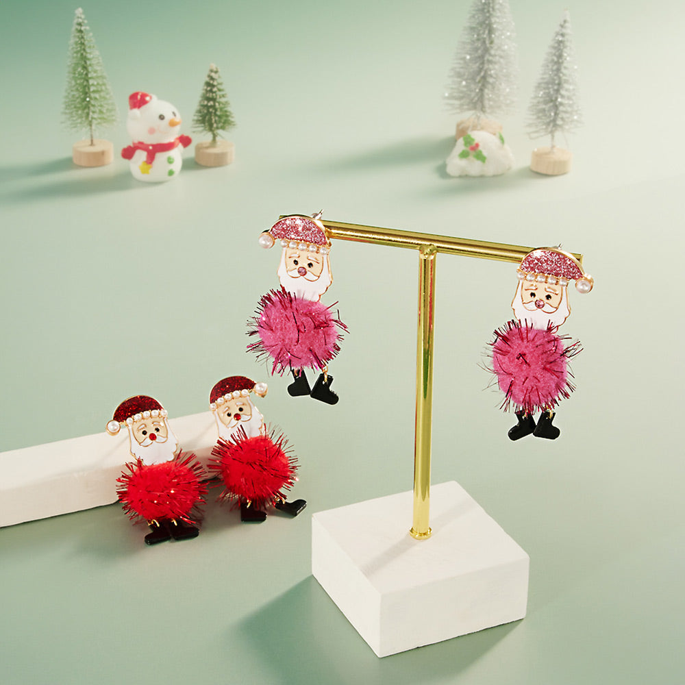 Spread holiday joy with these Santa pom-pom earrings, featuring a cheerful Santa figure with a fluffy textured body, glittery hat, and dangling boots. Perfect for festive events, these fun earrings make a playful statement and bring seasonal charm to any winter outfit.