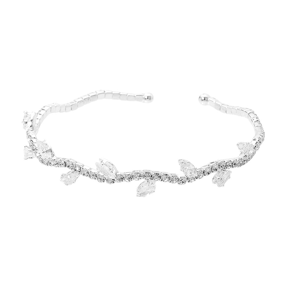 Grace your wrist with this elegant silver cuff bracelet featuring delicate leaf-shaped rhinestone details. A sophisticated design that adds a touch of refined sparkle to evening attire and special occasions. Adjustable fit for effortless styling.