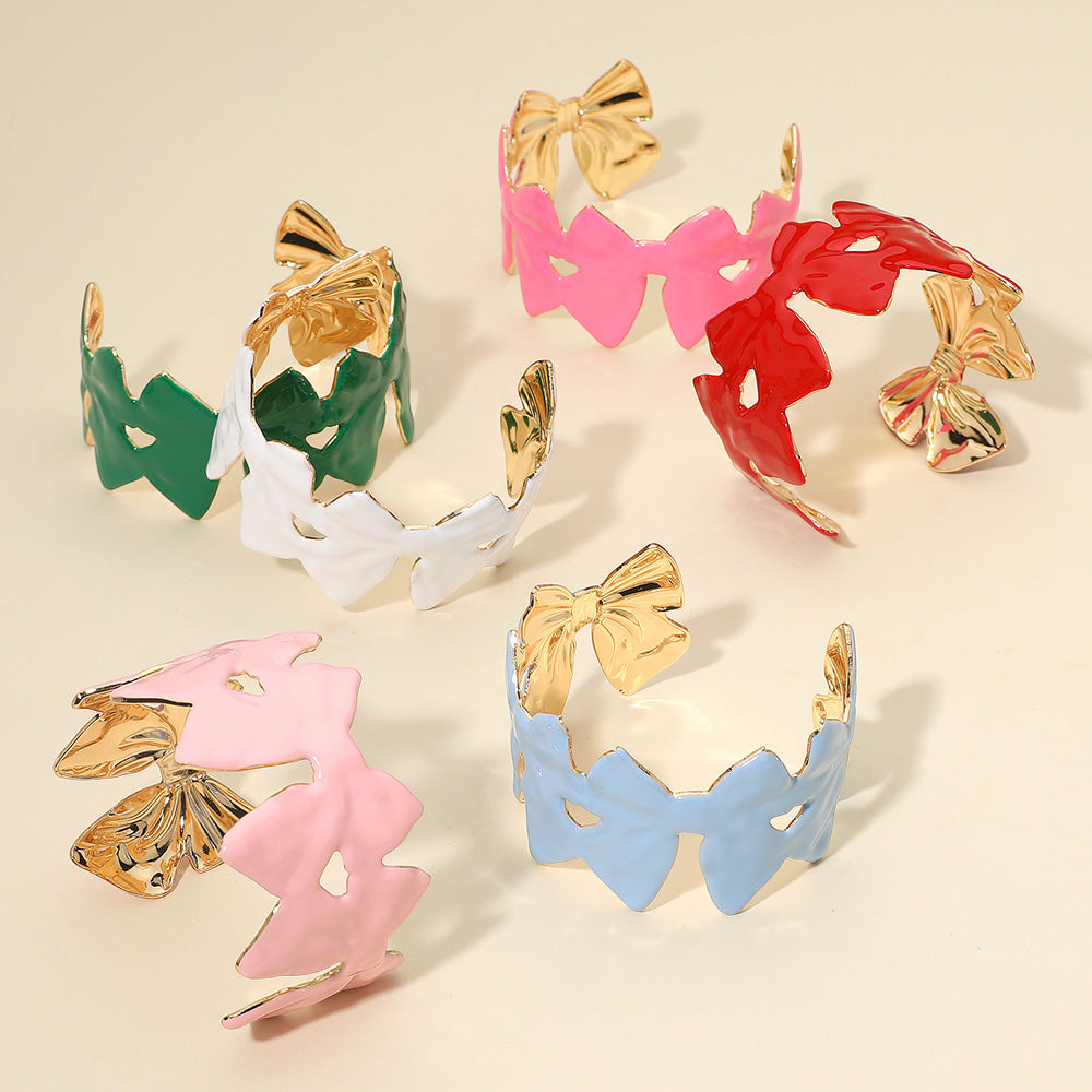 Chic cuff bracelet designed with enamel bow details in vibrant color options. Lightweight and adjustable, this playful statement piece adds a bold and stylish finish to everyday and dressy outfits.