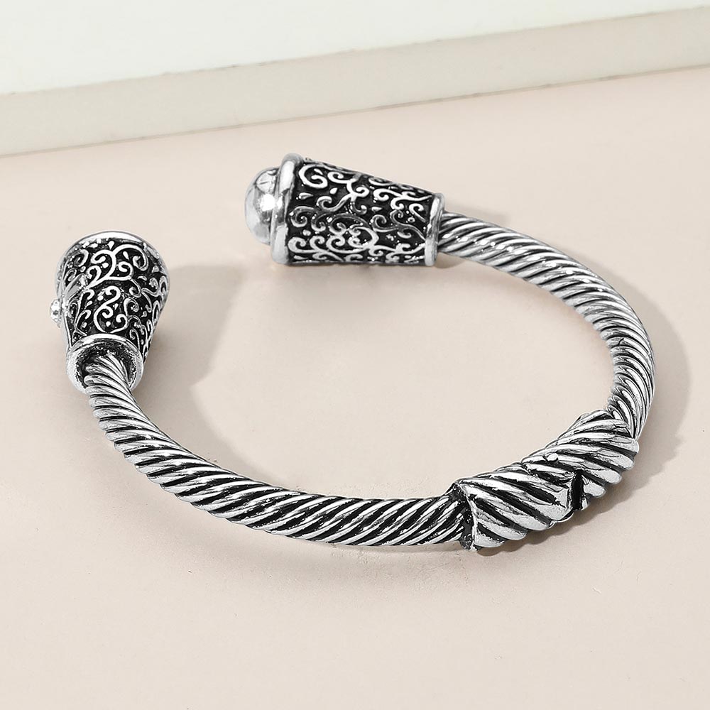 Add a bold vintage touch to your look with this open cuff bracelet featuring intricate scrollwork and raised end caps. Designed for effortless wear and statement style, ideal for both casual and dress occasions.