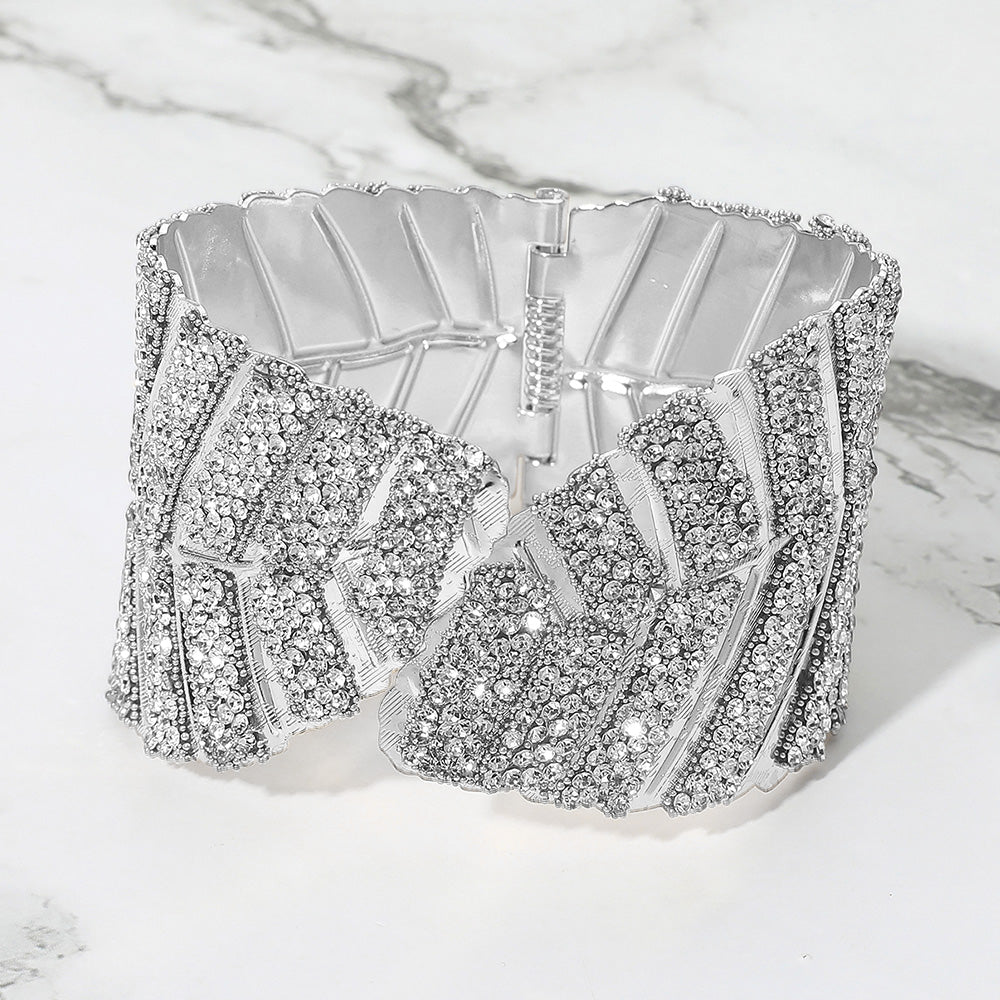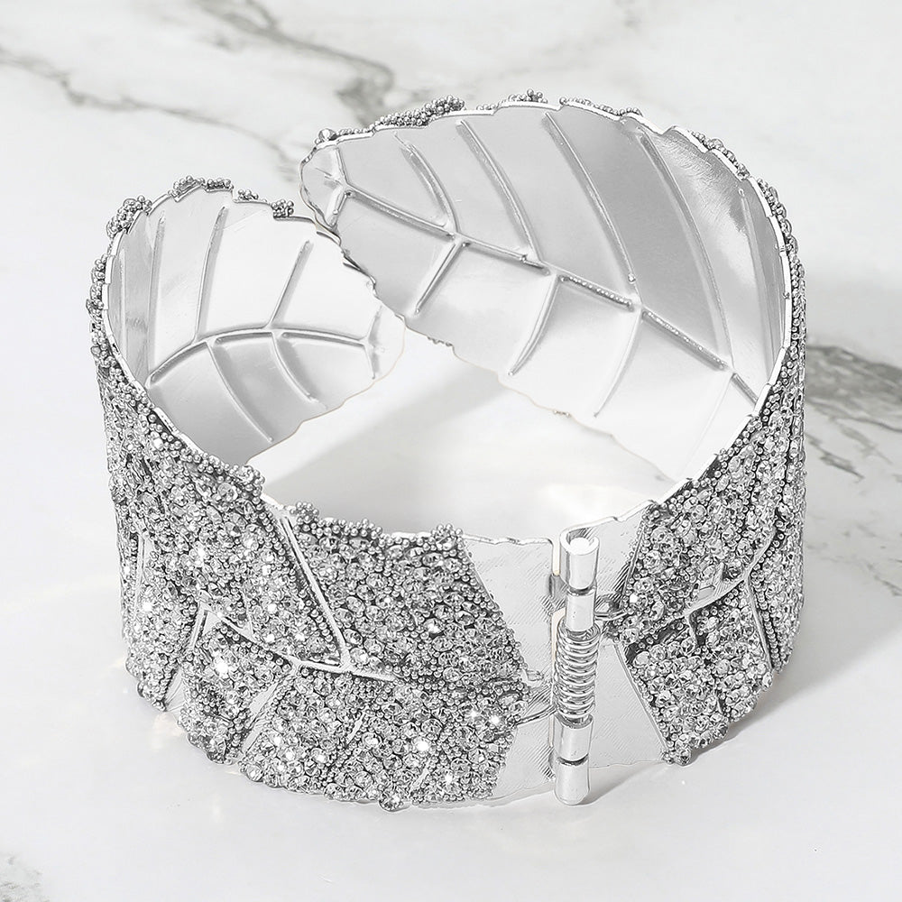 Bold wide cuff bracelet with an intricate leaf-inspired design encrusted with sparkling crystals. This glamorous statement piece elevates any outfit, perfect for evening events, parties, or special occasions. A luxurious accessory that adds dazzling shine and sophisticated elegance to your look.