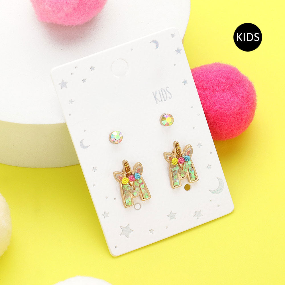 iLLASPARKZ 2Pairs - M Round Stone Unicorn Monogram Stud Kids Earrings