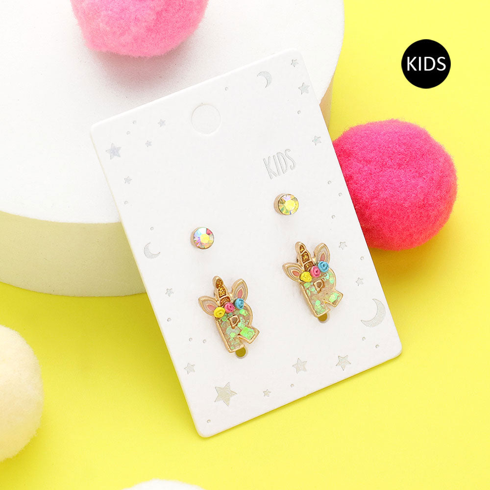 iLLASPARKZ 2Pairs - R Round Stone Unicorn Monogram Stud Kids Earrings