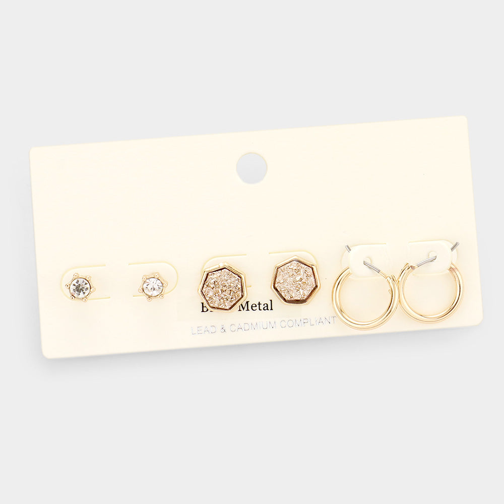 iLLASPARKZ 3Pairs - Brass Metal Round Stone Druzy Heptagon Hoop Earrings