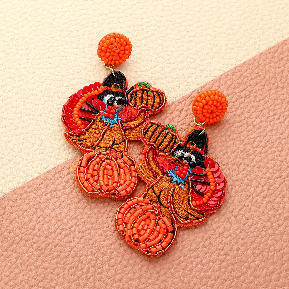 Add playful flair to your holiday look with these beaded turkey earrings, perfect for Thanksgiving celebrations. Featuring detailed embroidery and festive charm, they’re a standout seasonal accessory.