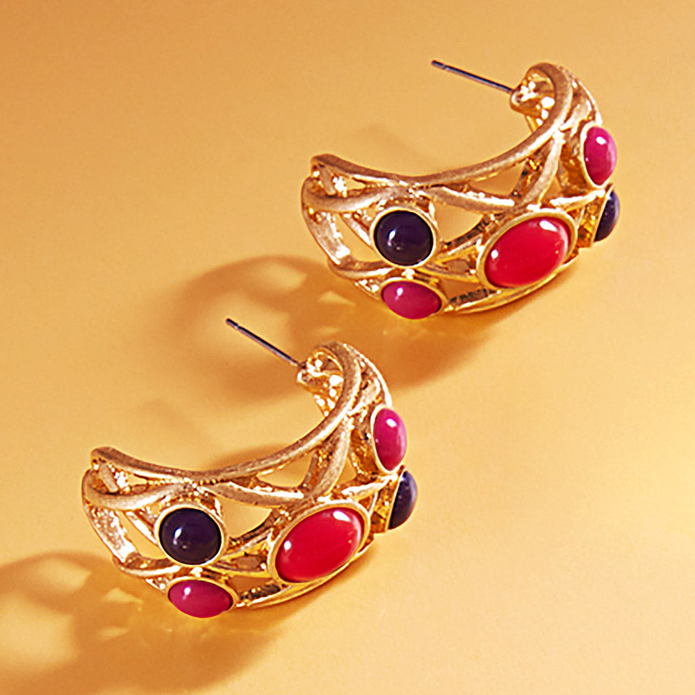 Make a bold statement with these sculpted gold-tone hoop earrings, featuring rich blue, green, and amber stones. Their elegant, artistic design adds vintage charm to any outfit—perfect for dressing up casual looks or complementing evening wear.
