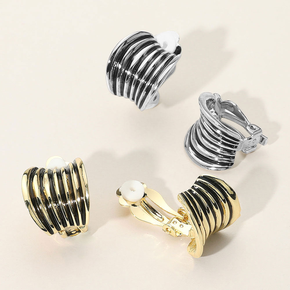 Layered clip-on hoop earrings featuring a sleek striped finish and bold silhouette. Designed for non-pierced ears, these earrings add a modern touch to everyday or evening looks with effortless style.