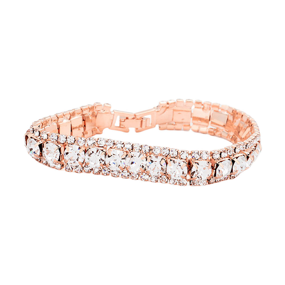 This elegant double row bracelet features iridescent stones framed by shimmering accents for a radiant, eye-catching look. With a secure clasp and refined design, it’s perfect for adding a touch of glamour to evening wear or elevating everyday outfits.
