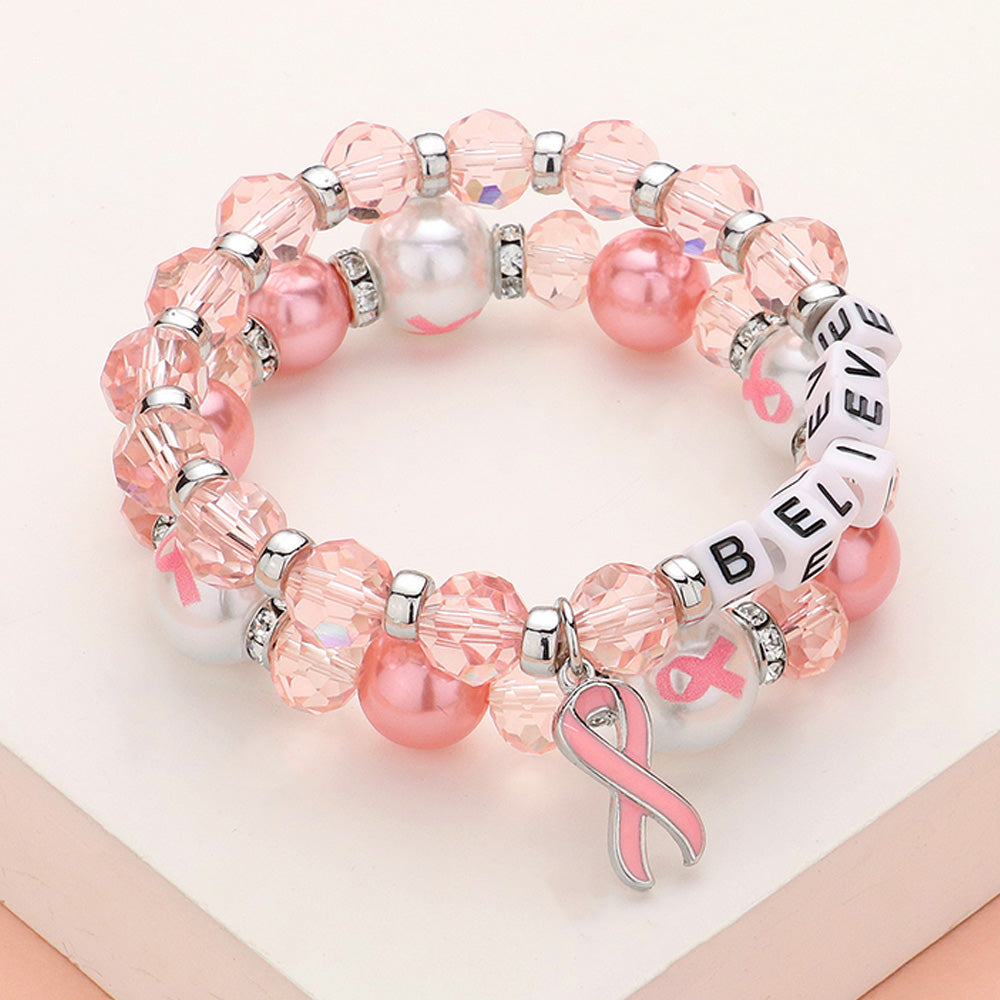 iLLASPARKZ 2PCS - BELIEVE Message Pointed Pink Ribbon Charm Faceted Beaded Stretch Double Layered Bracelets