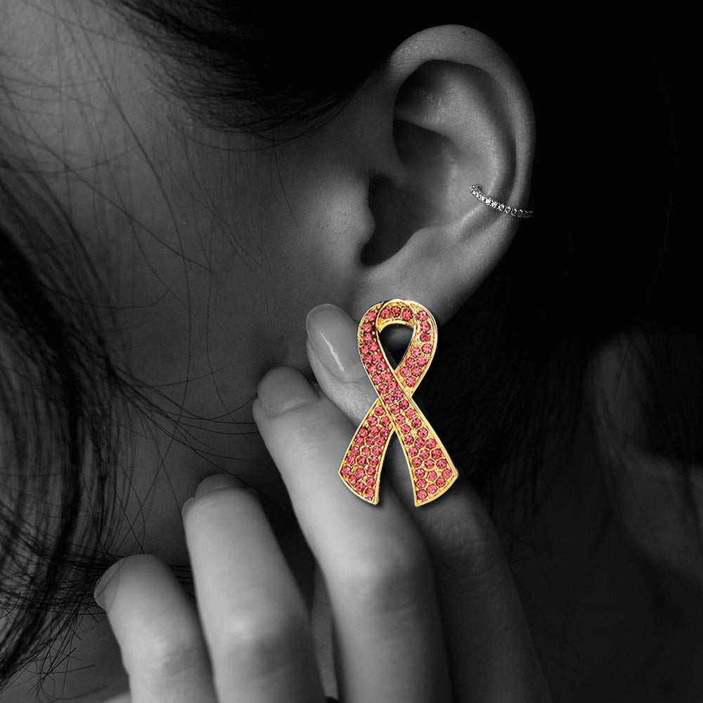 Elegant pink ribbon stud earrings adorned with sparkling crystals. A meaningful accessory to show support and raise awareness, perfect for daily wear or special events.
