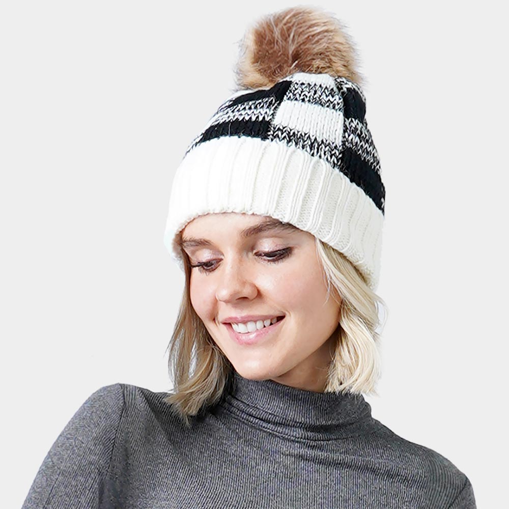 iLLASPARKZ Buffalo Check Pattern Faux Pom Pom Knit Beanie Hat