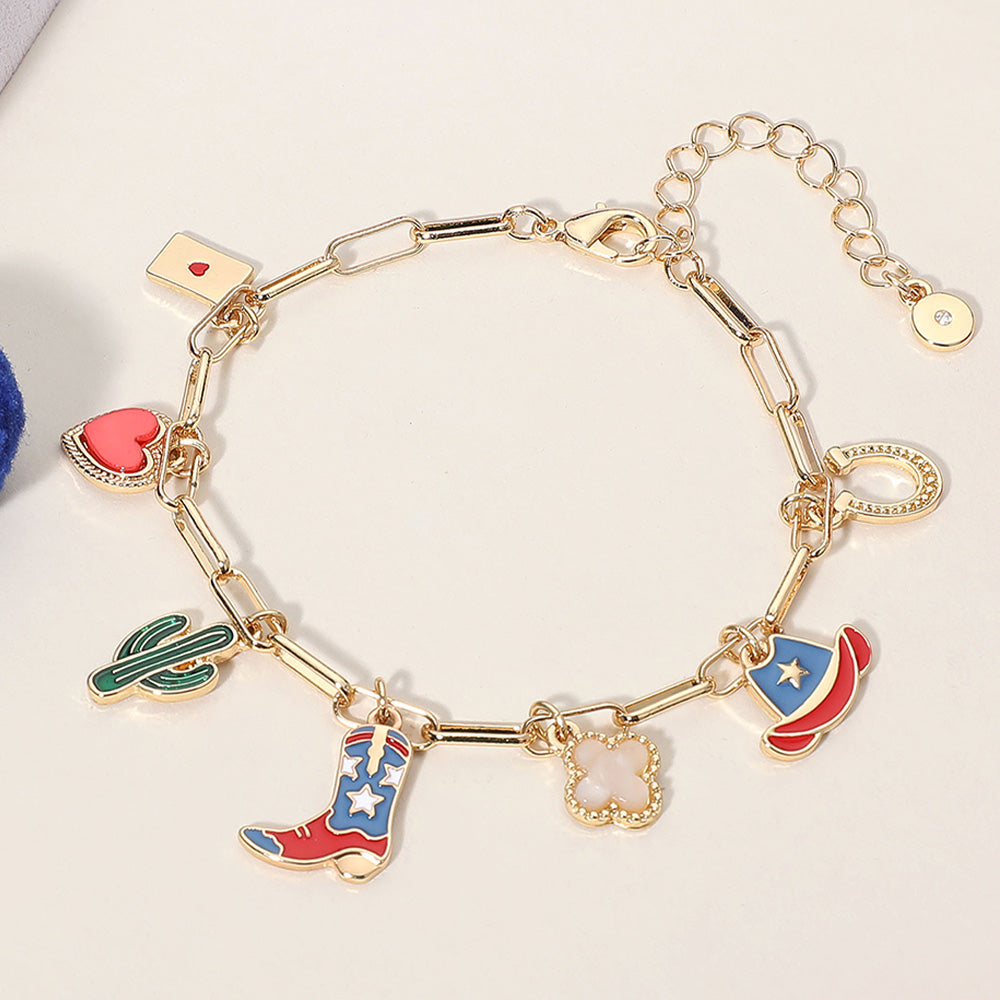iLLASPARKZ Enamel American USA Flag Western Cowboy Boot Hat cactus Heart Horseshoe Quatrefoil Charm Station Bracelet