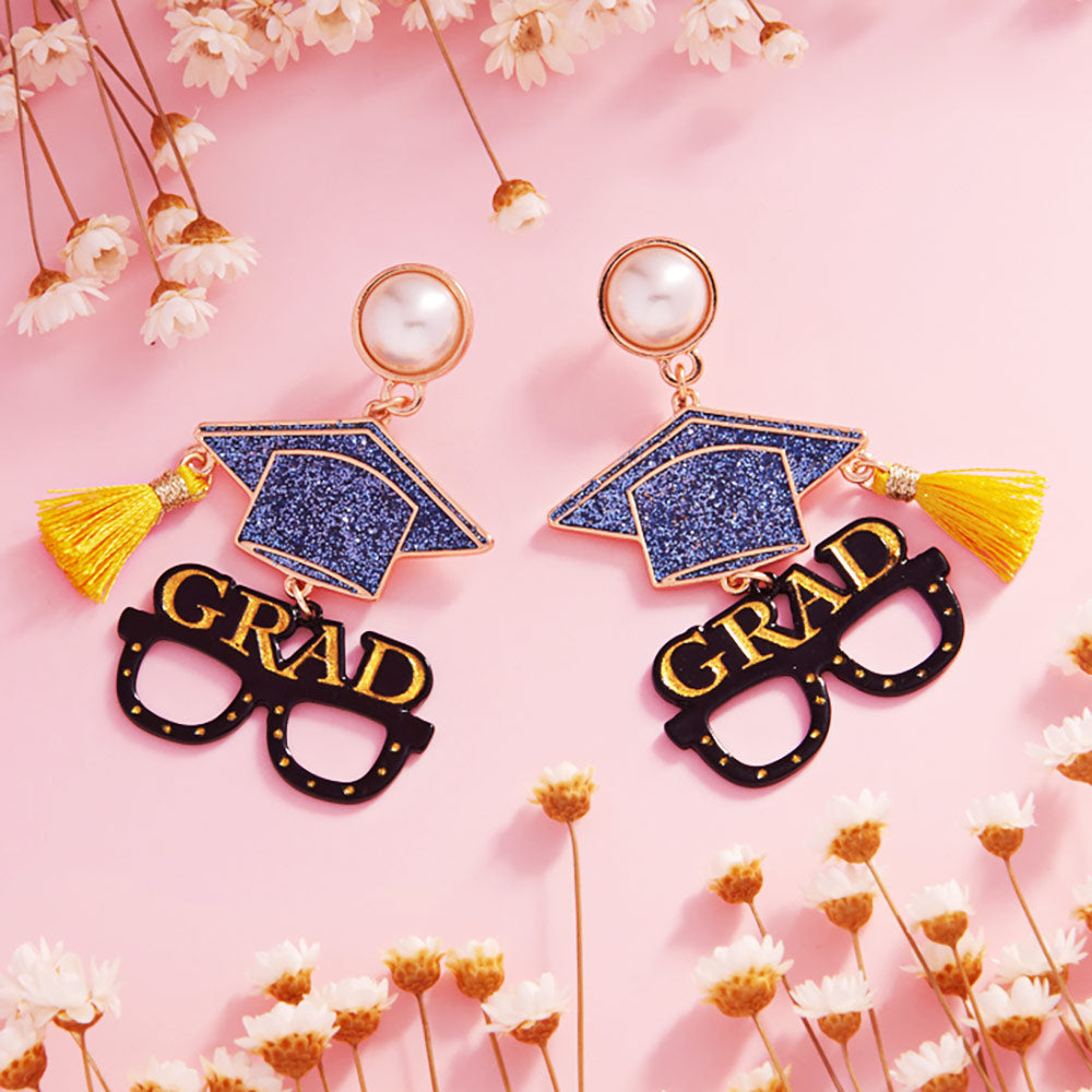 iLLASPARKZ Enamel Tassel Grad Hat Glasses Pearl Dangle Earrings