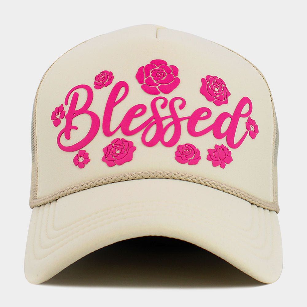 Stylish pink and white mesh-back cap with 3D floral “Blessed” print. Features breathable design and adjustable snapback for a comfy fit—perfect for everyday wear or casual faith-inspired looks.