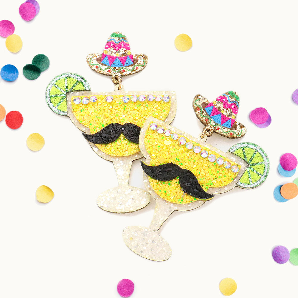 iLLASPARKZ Glittered Hat Mustache Pointed Lime Cocktail Link Dangle Earrings