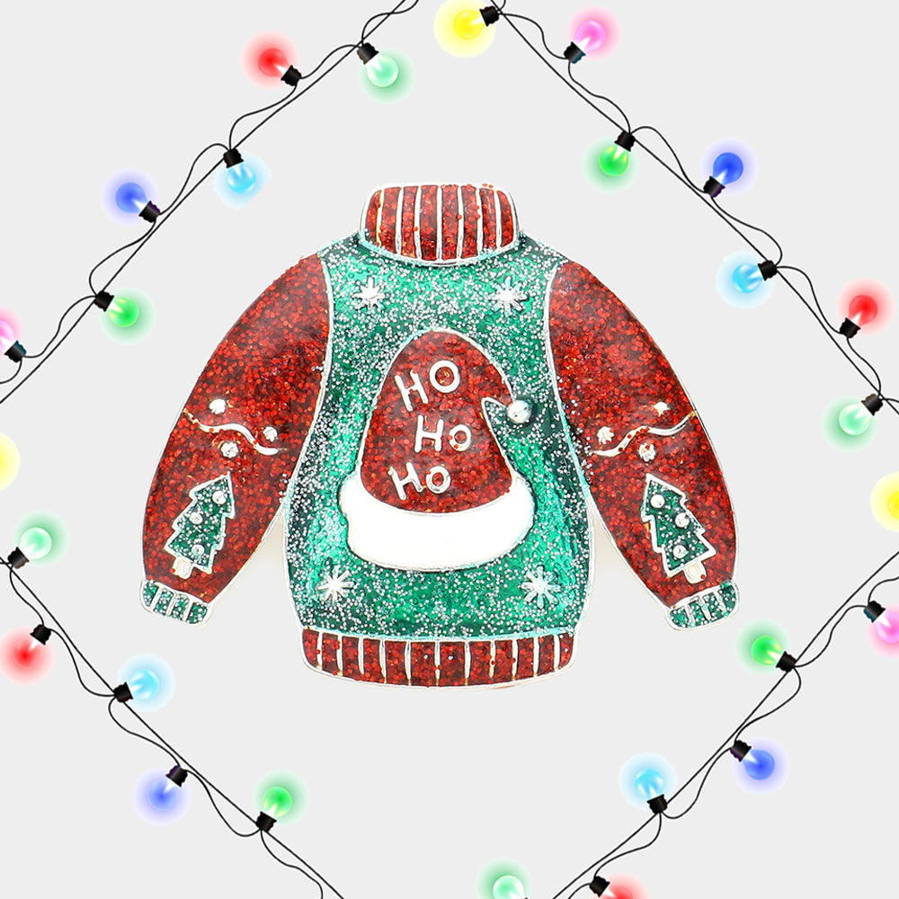 Celebrate the season in style with this whimsical holiday sweater brooch featuring a cheerful Santa hat and festive tree accents. A fun and eye-catching addition to your winter wardrobe or a great stocking stuffer for holiday lovers.