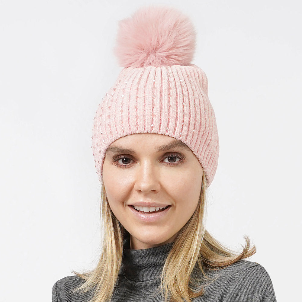 iLLASPARKZ Stone Embellished Chenille Pom Pom Beanie Hat