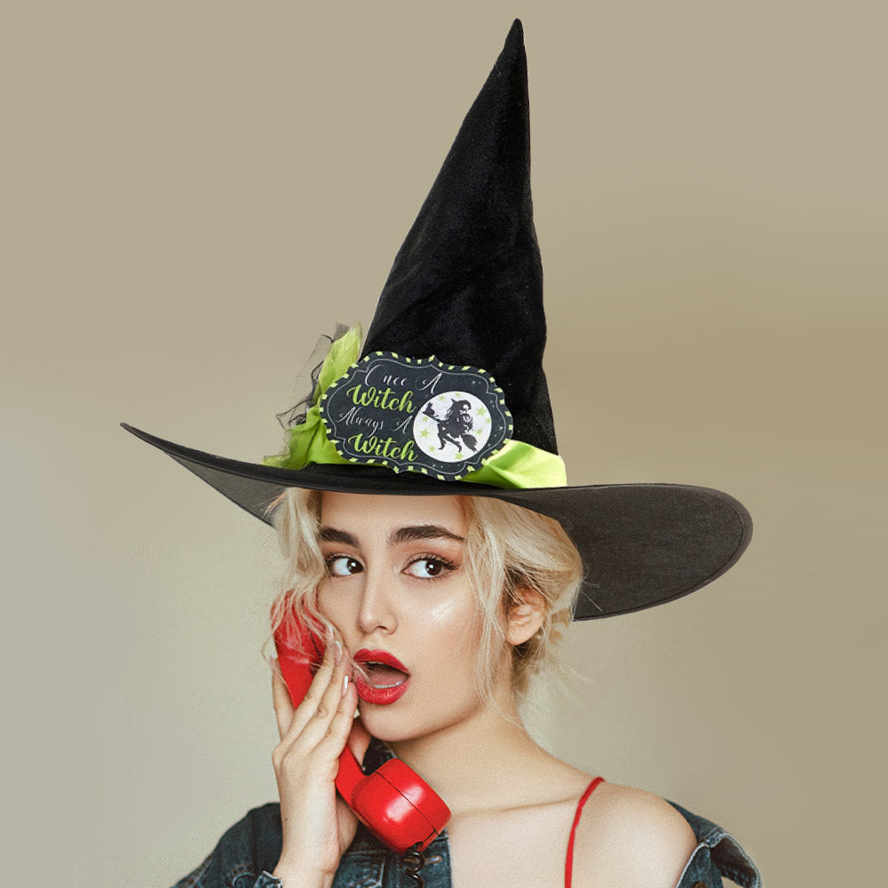 Charming pointed witch hat with a bright green ribbon, Halloween badge, and feather embellishment. A perfect accessory for Halloween costumes, themed parties, or cosplay fun.