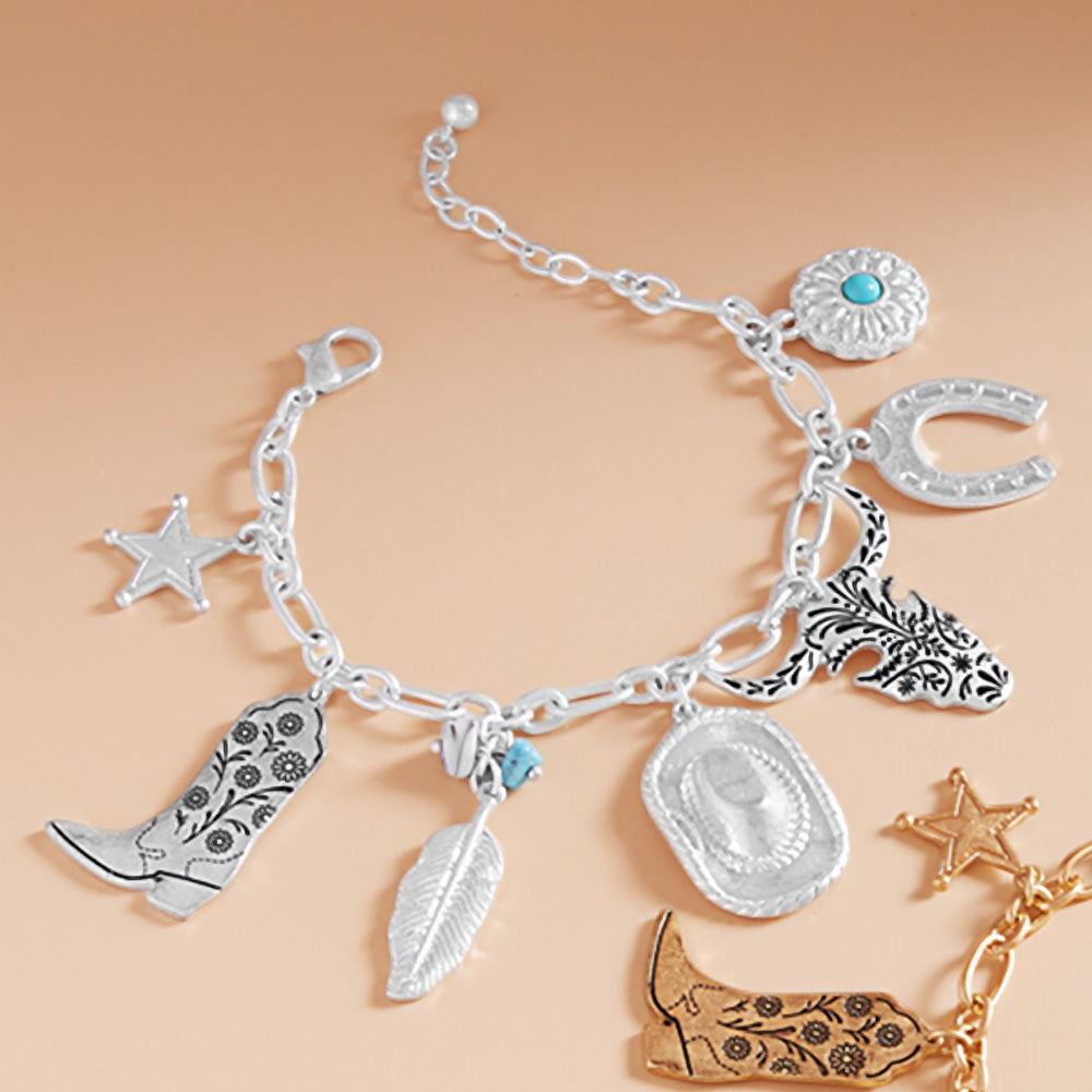 iLLASPARKZ Western Cowboy Boot Hat Steer Head Horseshoe Star Charm Station Bracelet