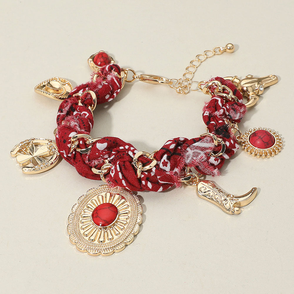 This statement bracelet blends Western-inspired charms—like a boot, hat, and pistols—with bold patterned fabric and decorative medallions. A playful accessory that adds personality and flair to casual or festival-ready looks.