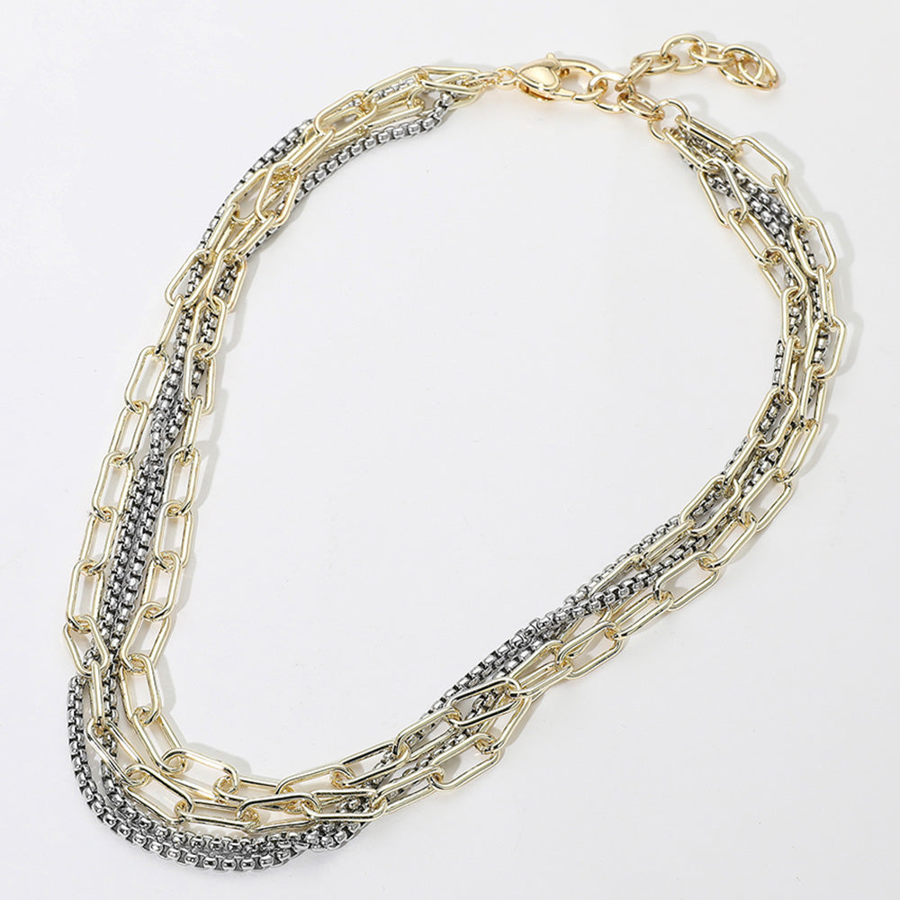 Stylish layered necklace featuring alternating paperclip and box chain designs. A chic combination of shapes and textures, perfect for elevating any look.