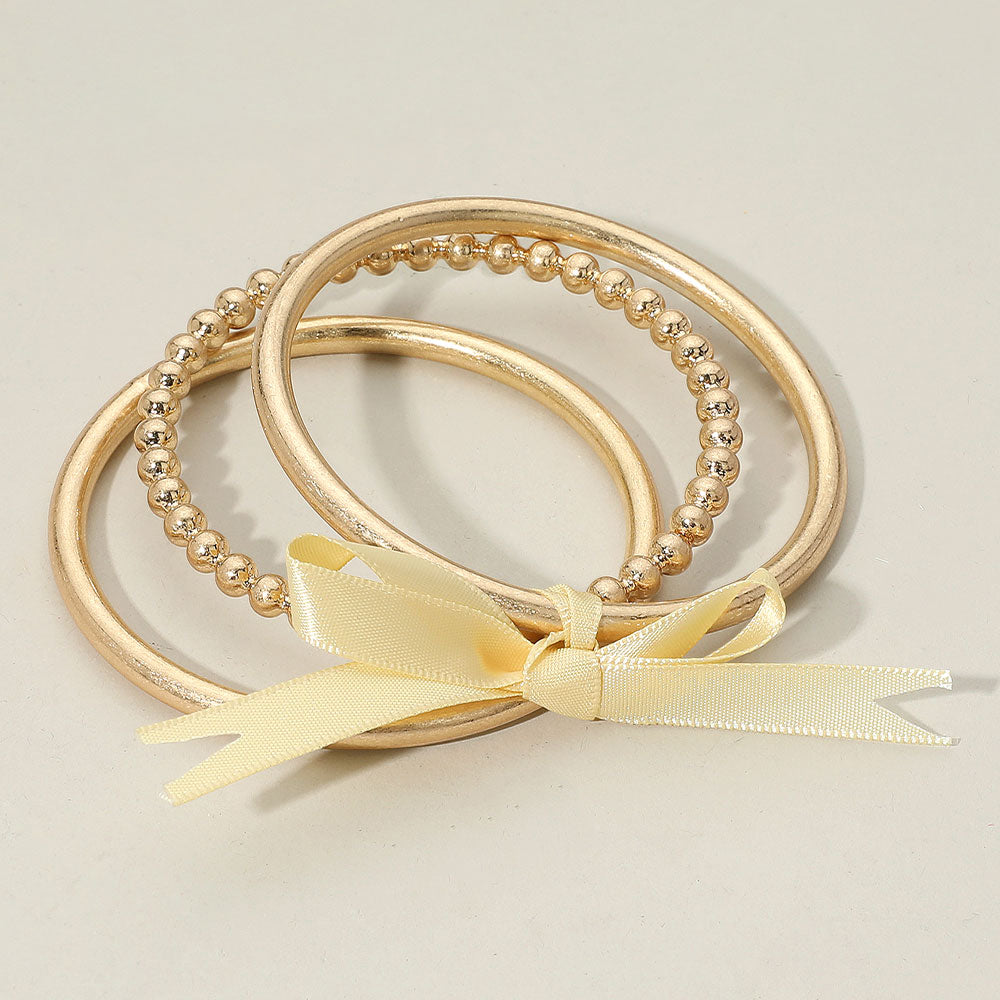 Add a touch of elegance with this 3-piece bangle bracelet set featuring smooth and beaded textures, accented by a charming satin bow. Lightweight and stackable, these bangles are perfect for layering and enhancing both casual and formal outfits. A chic accessory for day or night.