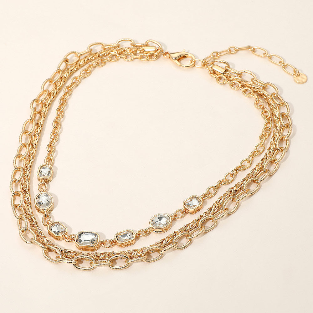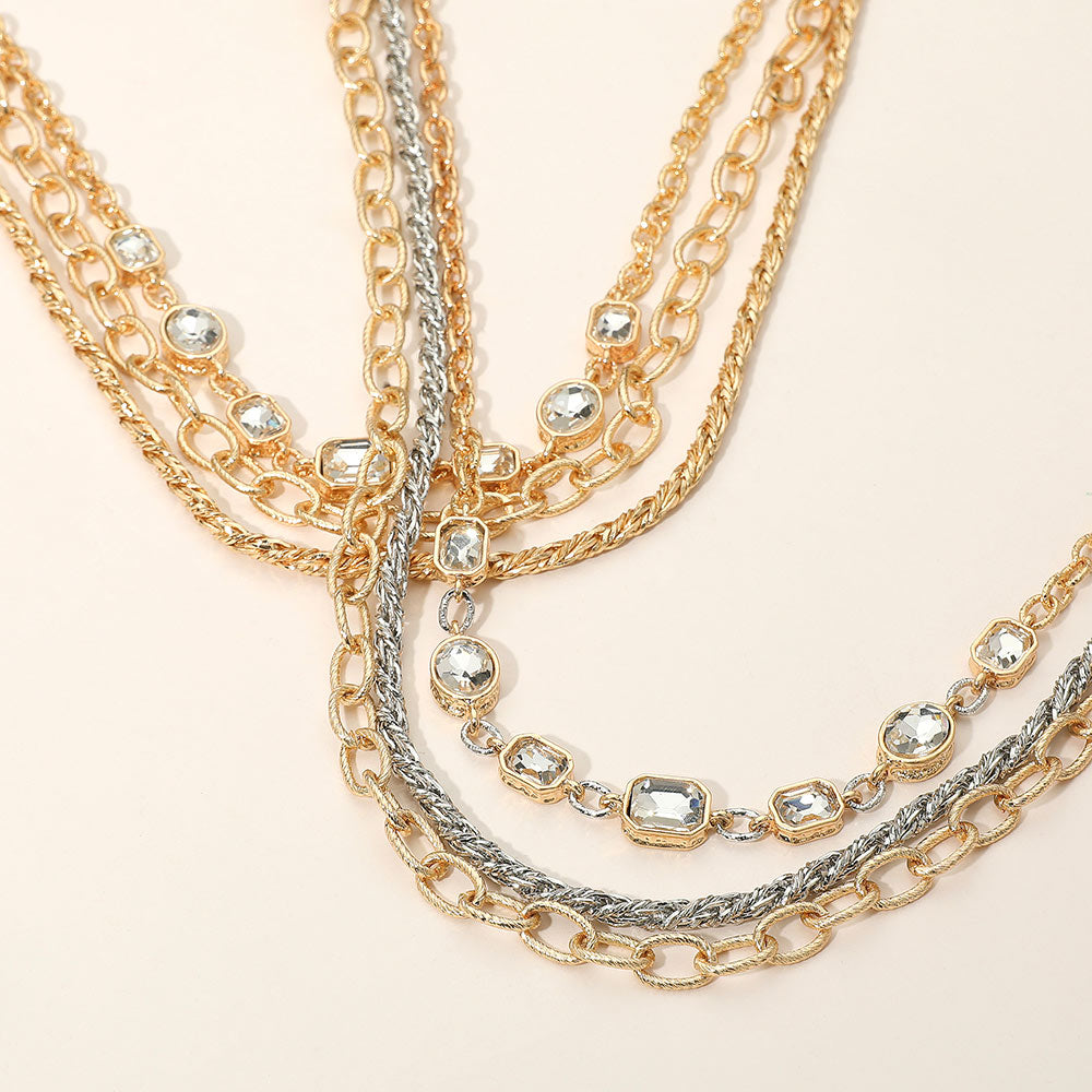 Elegant layered chain necklace featuring faceted crystal accents and mixed link styles. Perfect for adding sparkle and texture to any outfit, ideal for evening wear, parties, or chic everyday layering.