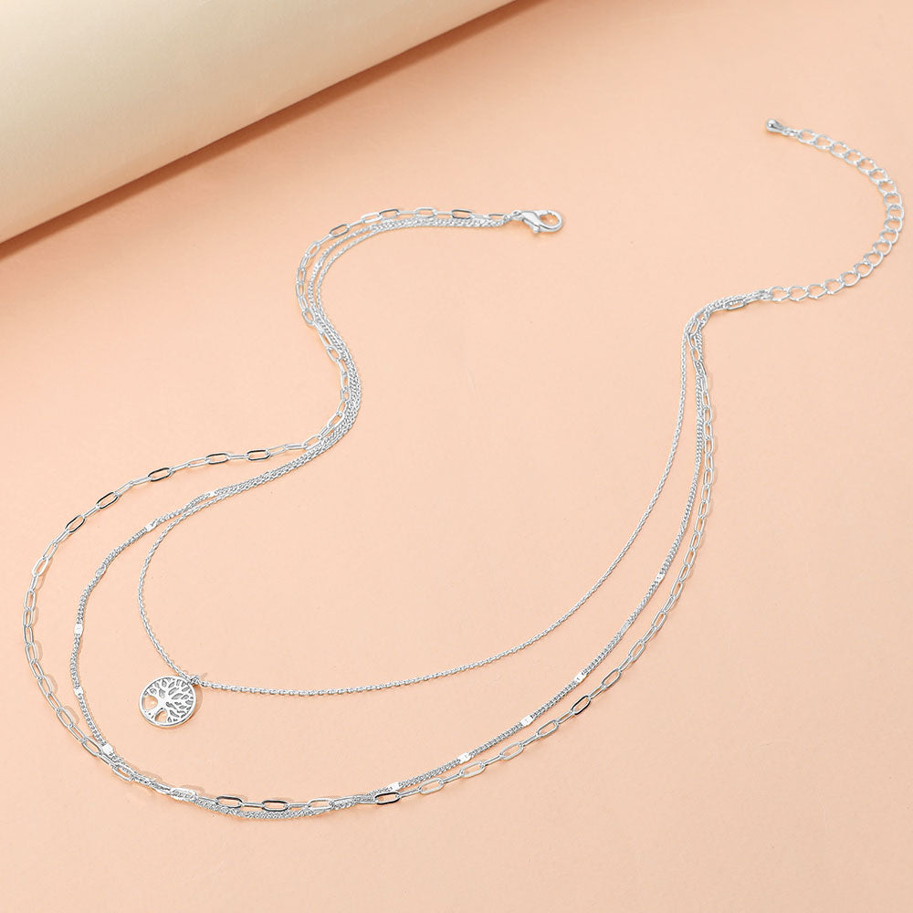 Layered necklace featuring three distinct chain styles and a circular pendant with a cutout tree design. A meaningful and stylish piece that adds depth to any outfit. Ideal for everyday wear or gifting, offering a blend of symbolism and contemporary elegance.