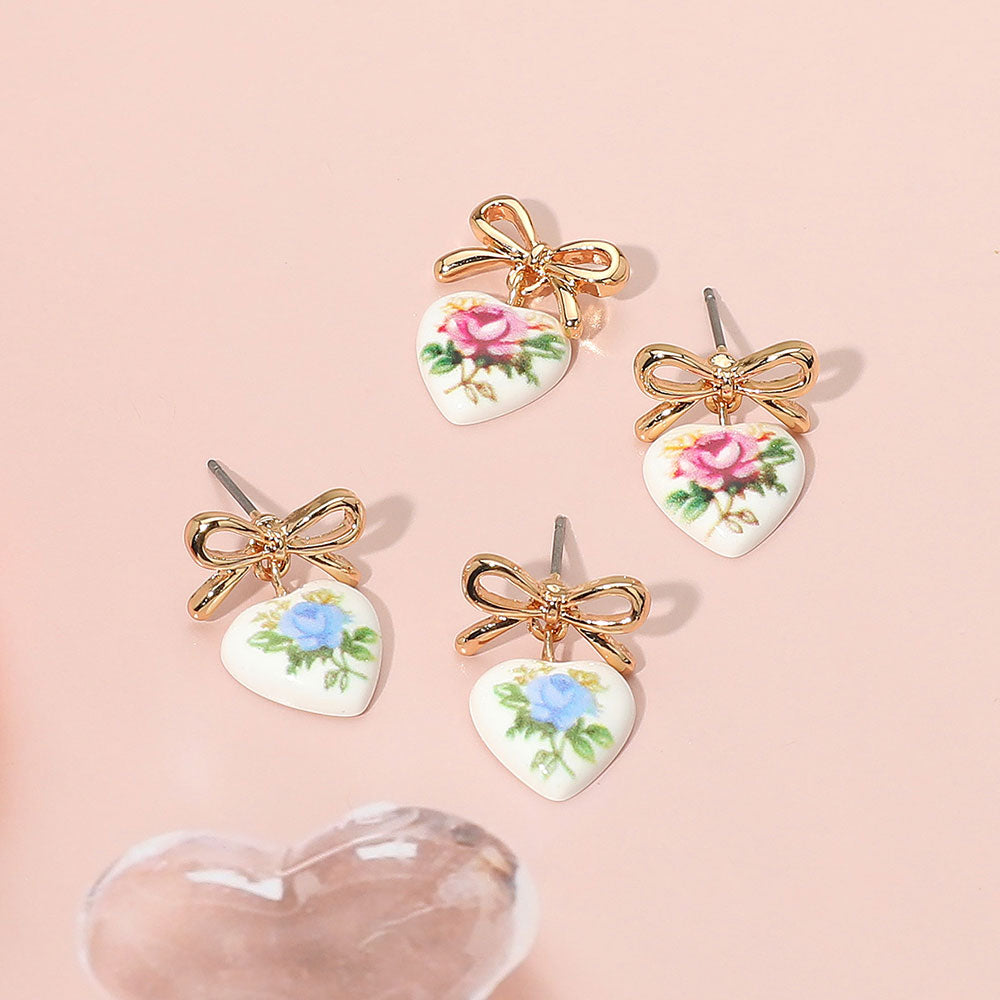 Elegant heart-shaped stud earrings with delicate floral porcelain inlays and classic bow accents—ideal for vintage charm and a feminine touch to any outfit or gift.