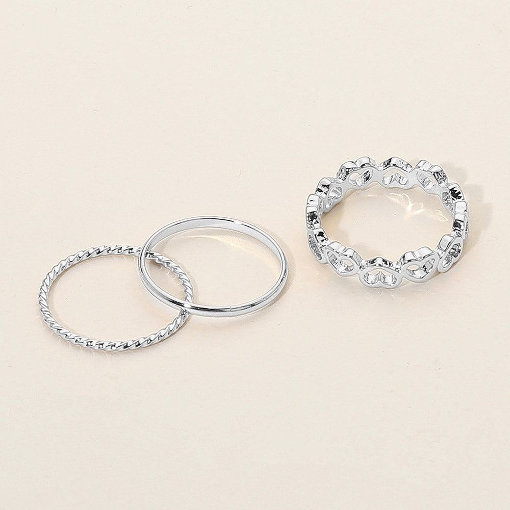 Charming three-piece ring set featuring heart motifs and sleek bands. A playful blend of romance and simplicity, ideal for stacking or gifting with love.