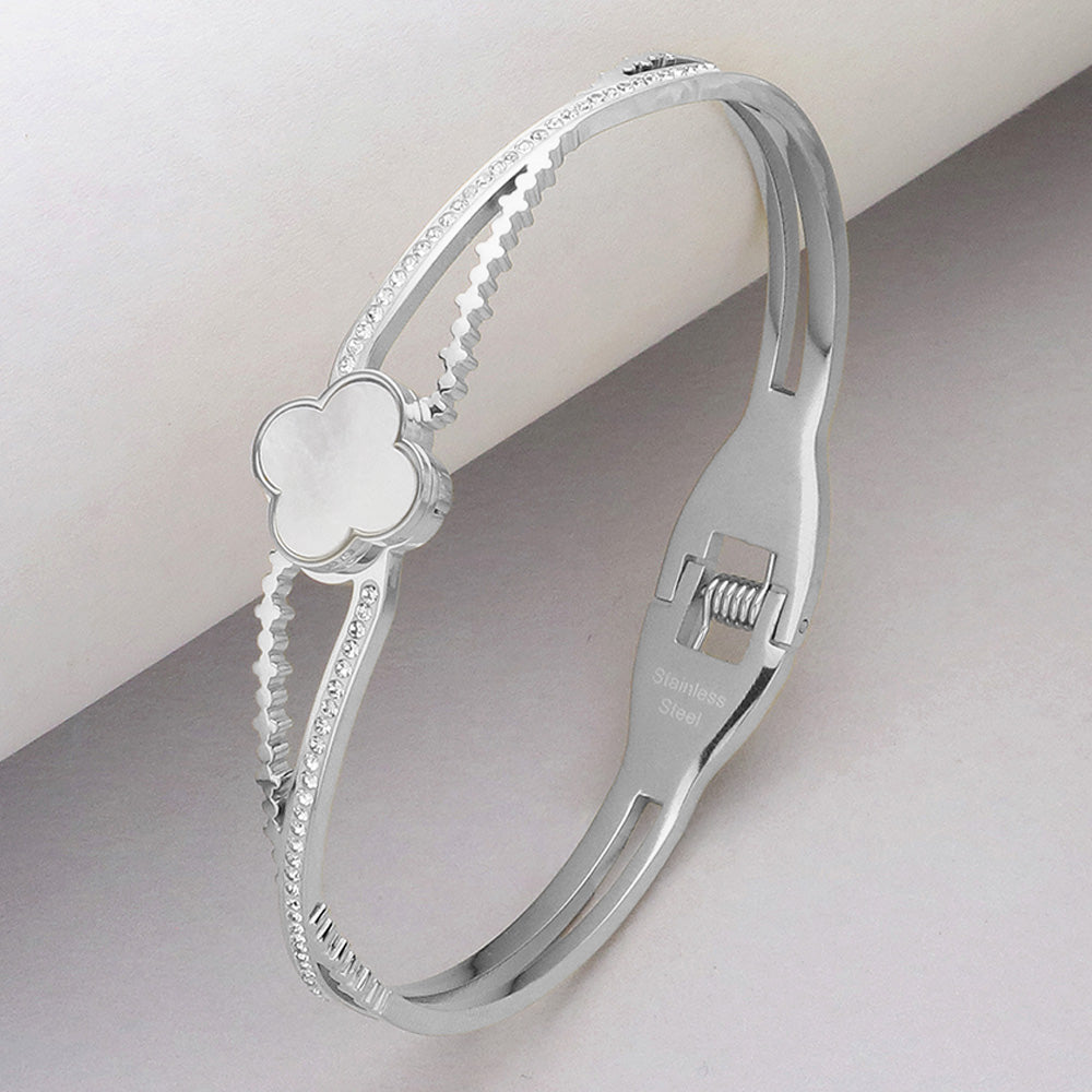 iLLASPARKZ Mother Of Pearl Quatrefoil Pointed Stone Paved Stainless Steel Hinged Bangle Bracelet