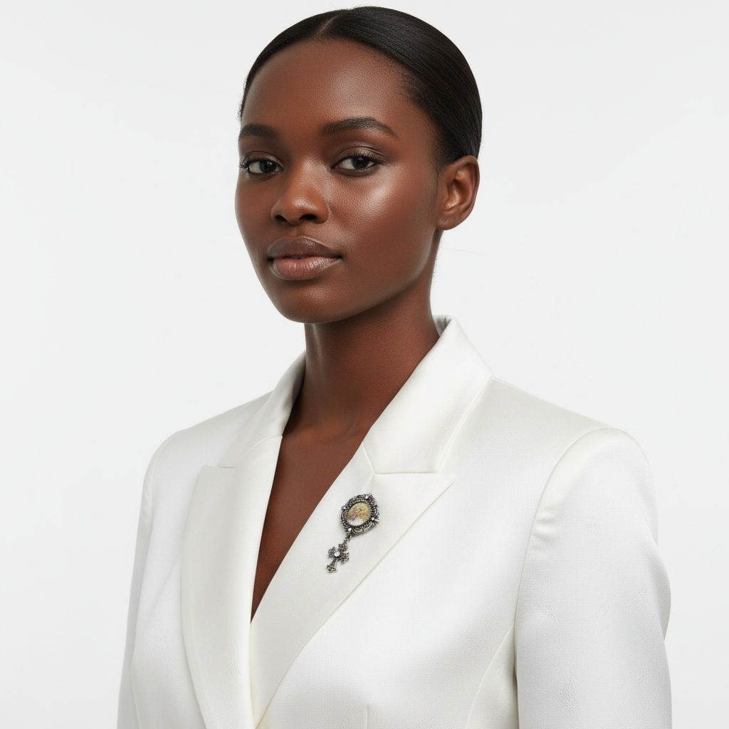 Women's Brooch Pin. Antique Finish Burnished Silver Metal Engraved Round Picture Frame Brooch Featuring Dangle Cross and Clear Rhinestone Details. Holds Picture 1 inch. Safety Pin Closure.