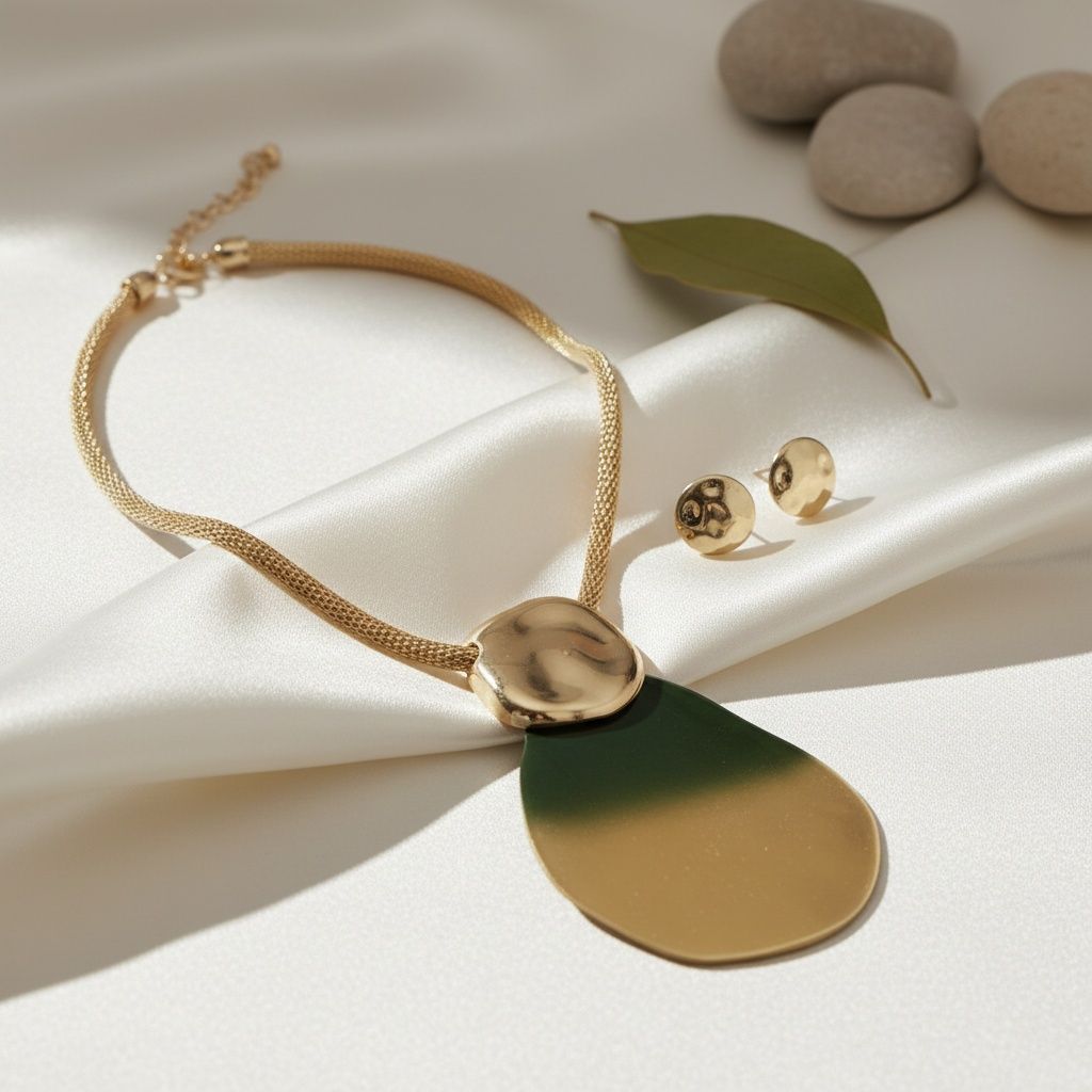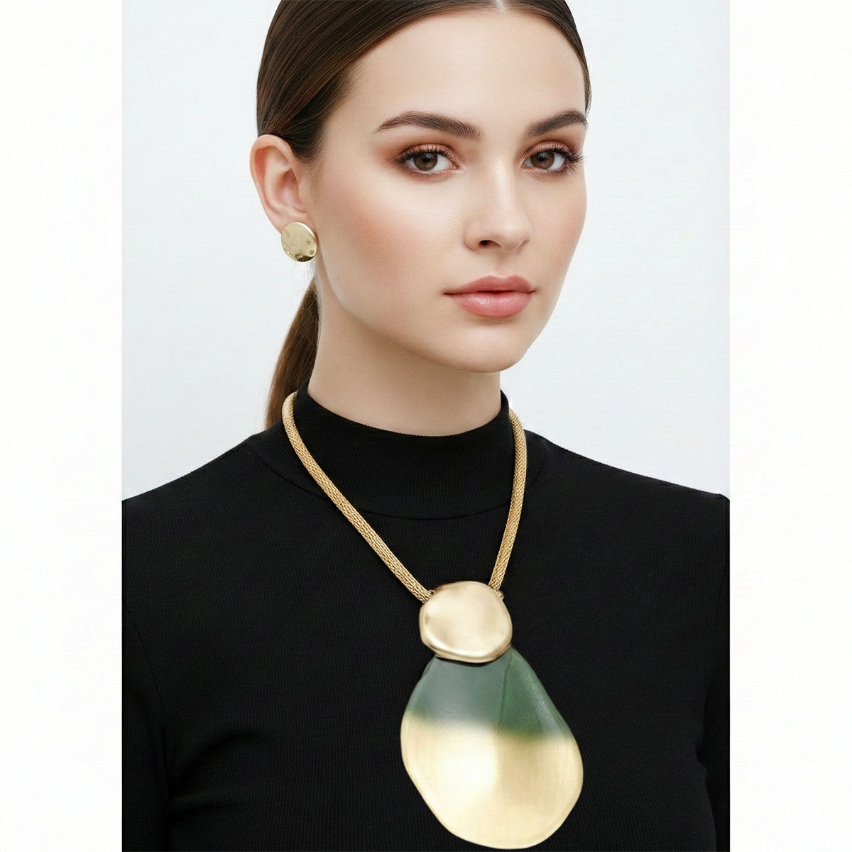 Women's Pendant Necklace Set. Bold Artisan Style Necklace Featuring Hollow Gold Metal Mesh Chain with Large Slide Pendant Comprised of Hammered Gold Acrylic with Green to Gold Ombre Organic Teardrop Shaped Acrylic Detail. Pendant Measures 4.65 inches x 3.15 inches. Lobster Clasp Closure. Includes Matching Hammered Disc Stud Post Backing Earrings.