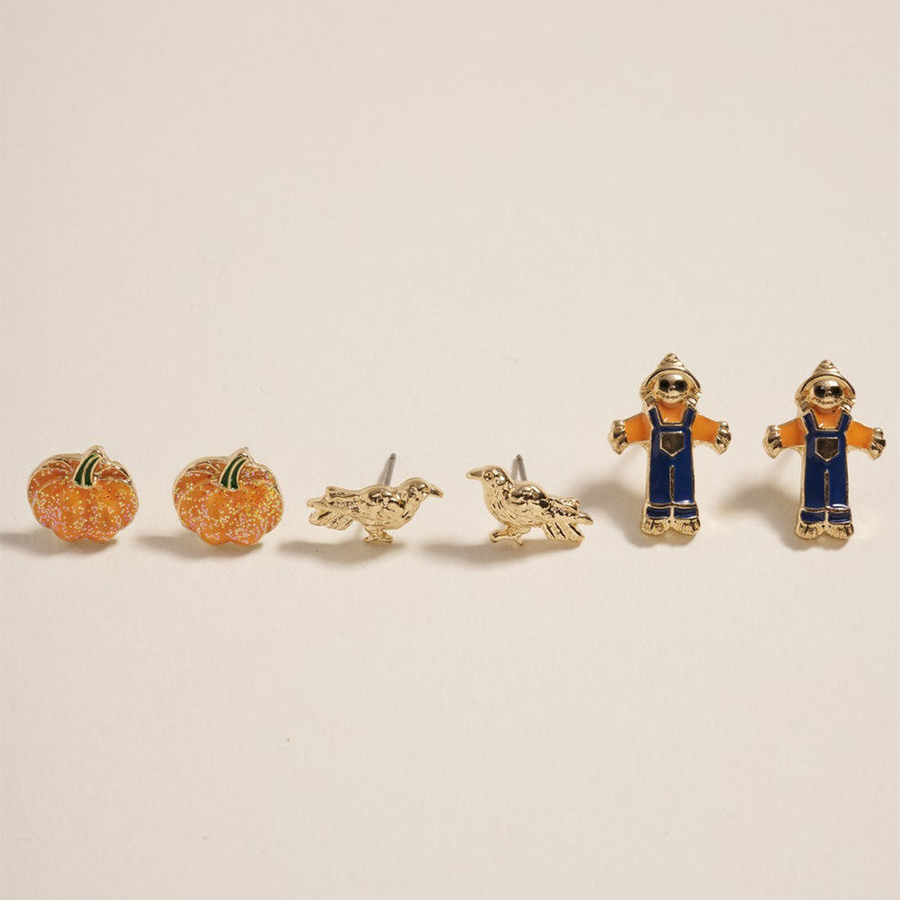 iLLASPARKZ 3Pairs - Autumn Pumpkin Bird Scarecrow Stud Earring Set