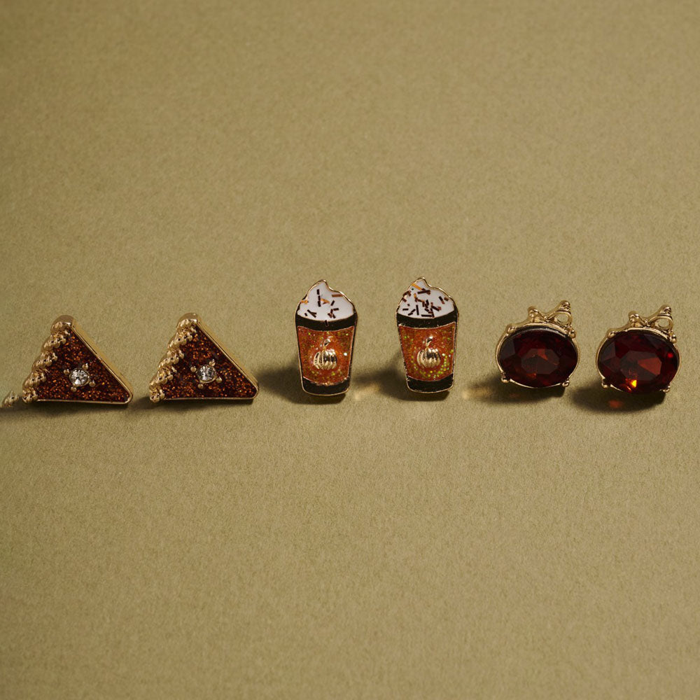 Get fall-ready with this three-pair earring set featuring faceted jewels, pumpkin spice latte charms, and glittery pie slice studs. A charming collection perfect for autumn outfits, coffee lovers, and seasonal gifting. Hypoallergenic posts for comfort.